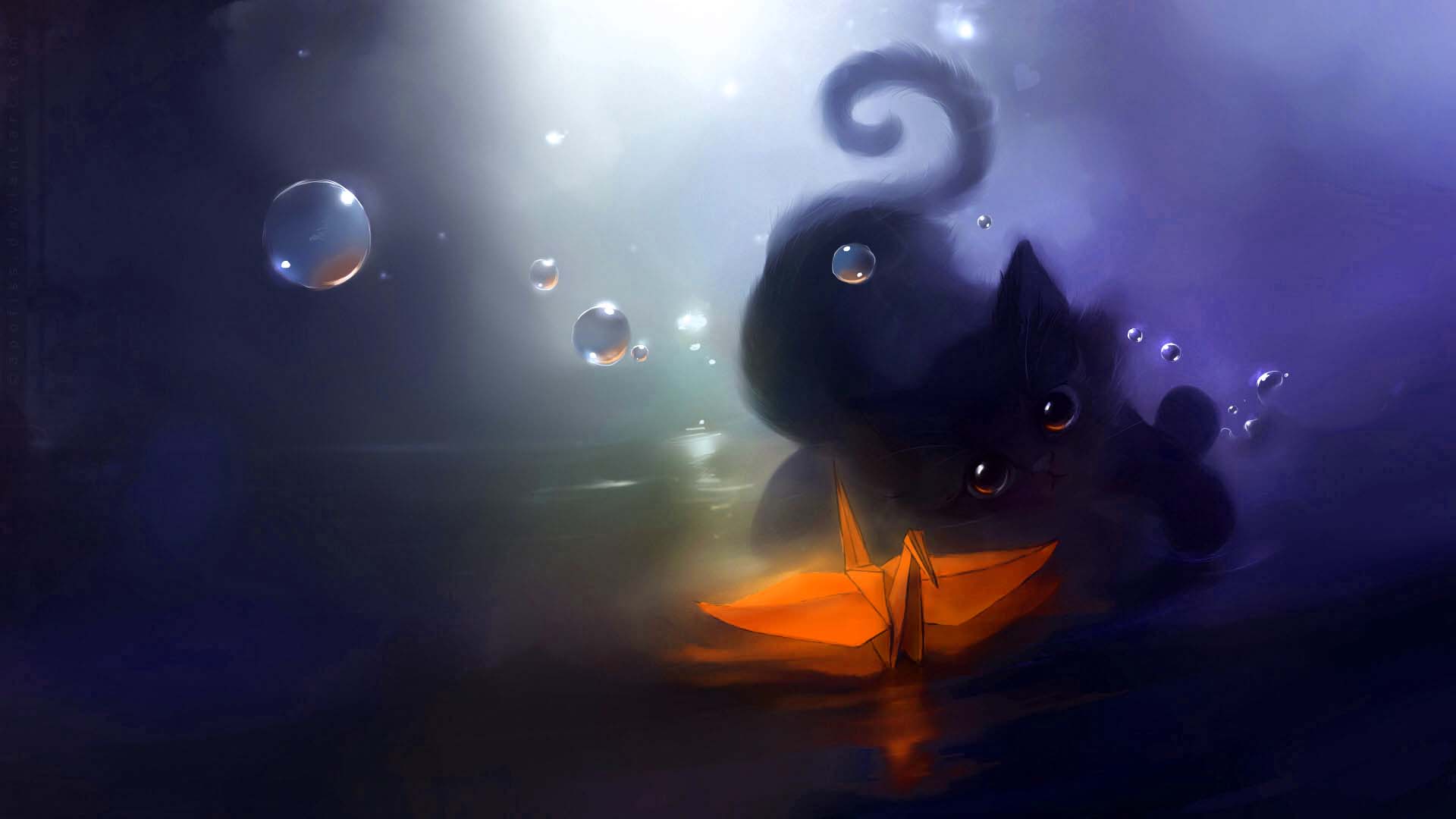 Description: A cat with an umbrella in the rain with bubbles floating around it and a cat with an umbrella in the rain.