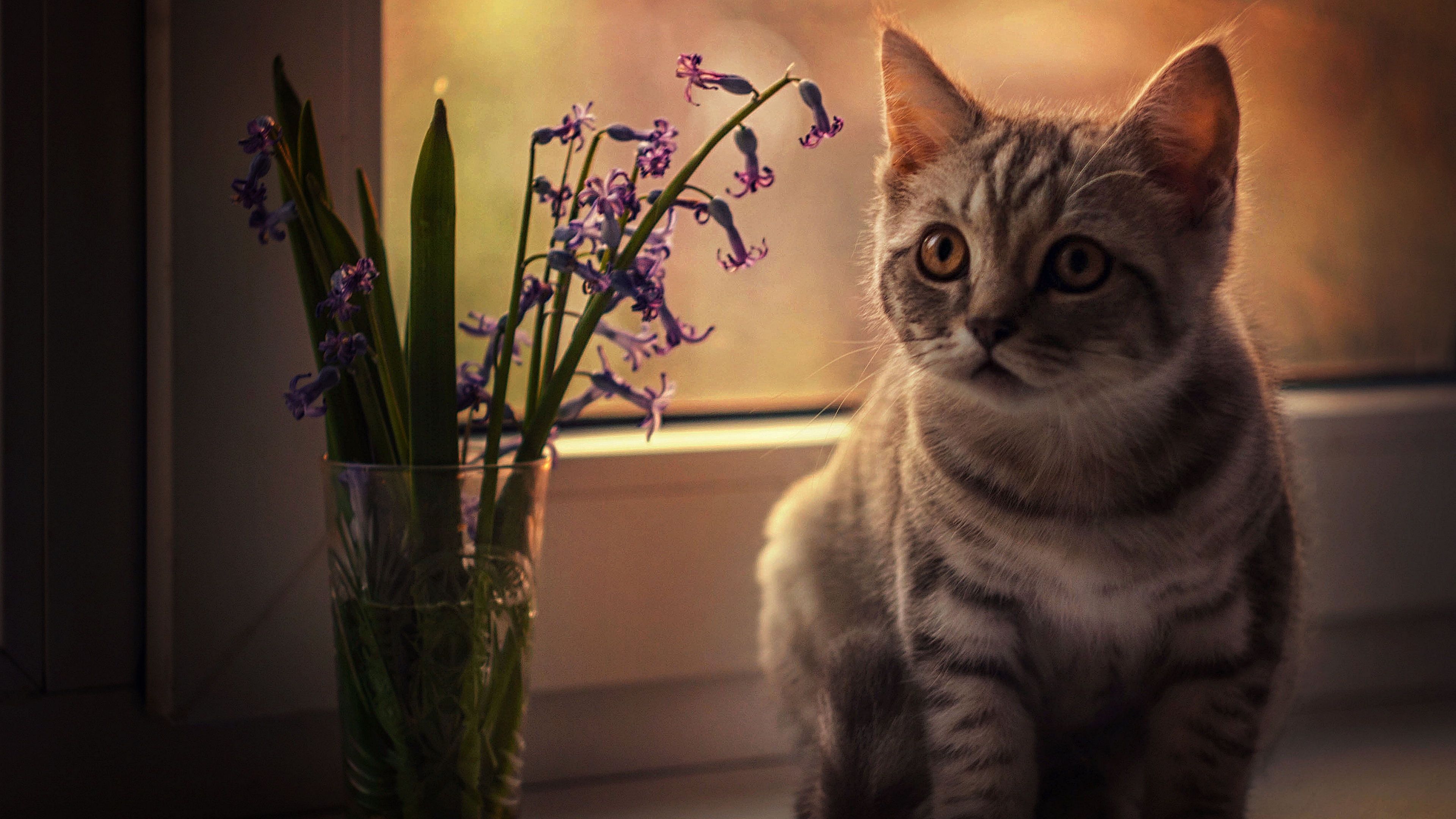 Description: A cat sitting next to a vase with flowers in it and a window behind it with a blurry background.