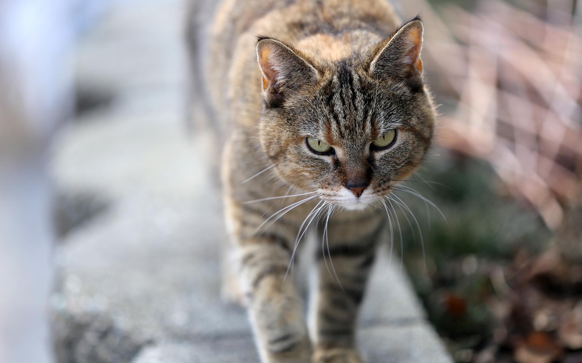 Description: A cat walking on a sidewalk with a blurry background and a blurry background behind it.