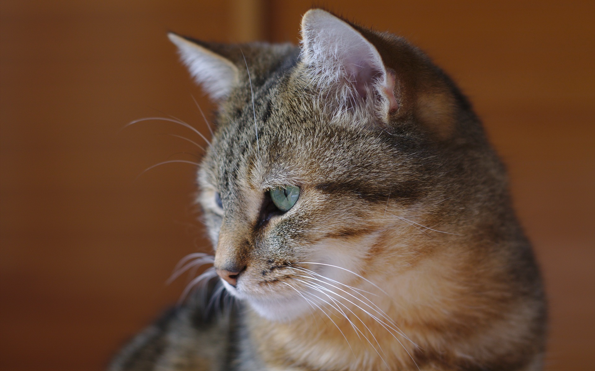 Description: A cat with a white whiskers on its face looking away from the camera with a blurry background.