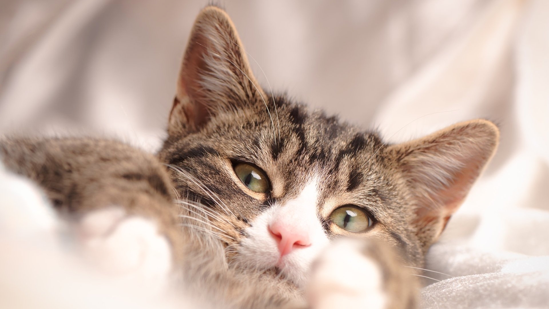 Description: A cat laying on a white blanket with its eyes open and a nose wide open.