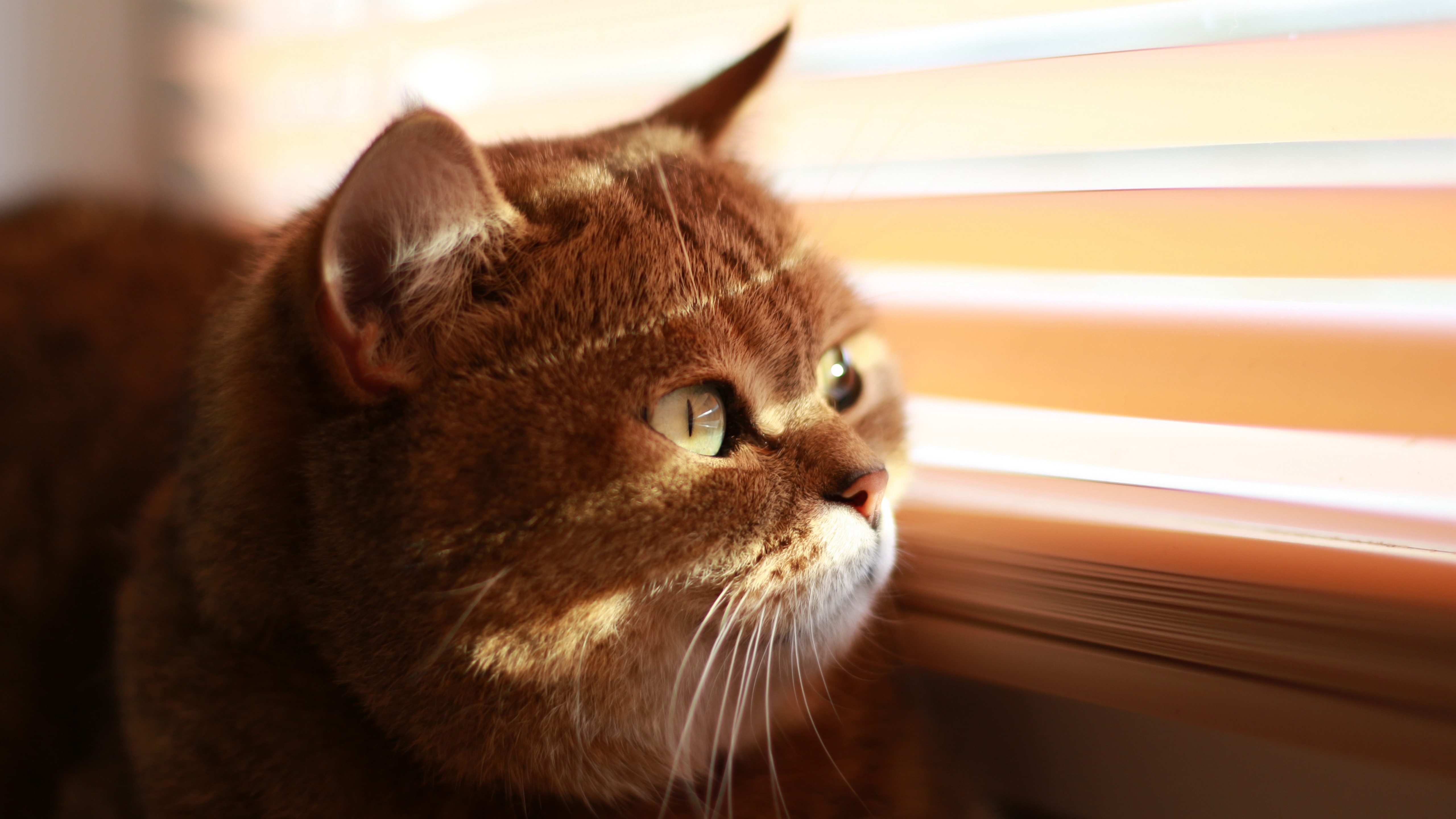 Description: A cat is looking out of a window with blinds on it's sides and a cat is looking out of the window.
