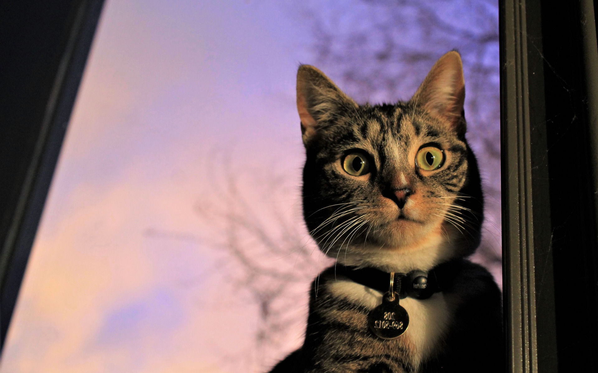 Description: A cat looking out a window at the camera with a tree in the background and a purple sky in the background.