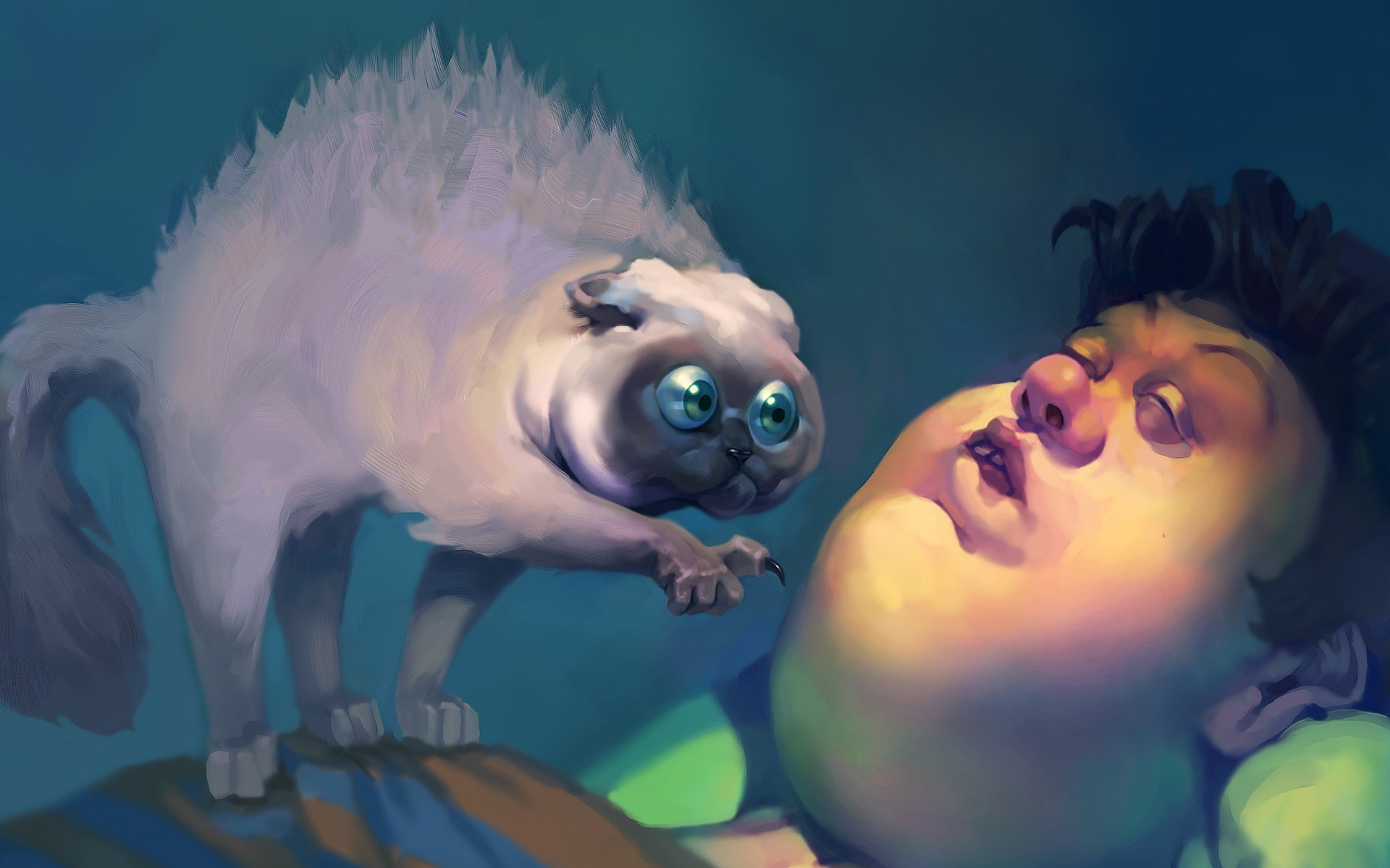 Description: A painting of a cat and a woman's face with a cat on her back.