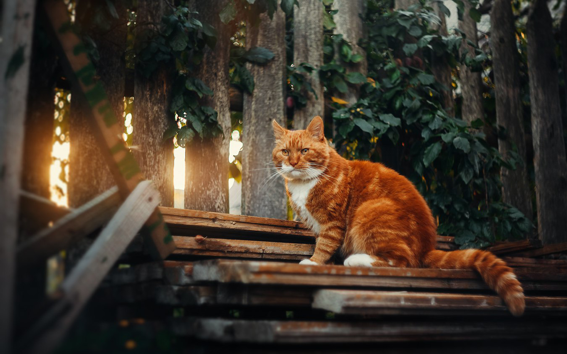 Description: A cat sitting on a wooden platform in the woods with trees in the background and a light shining on the ground.