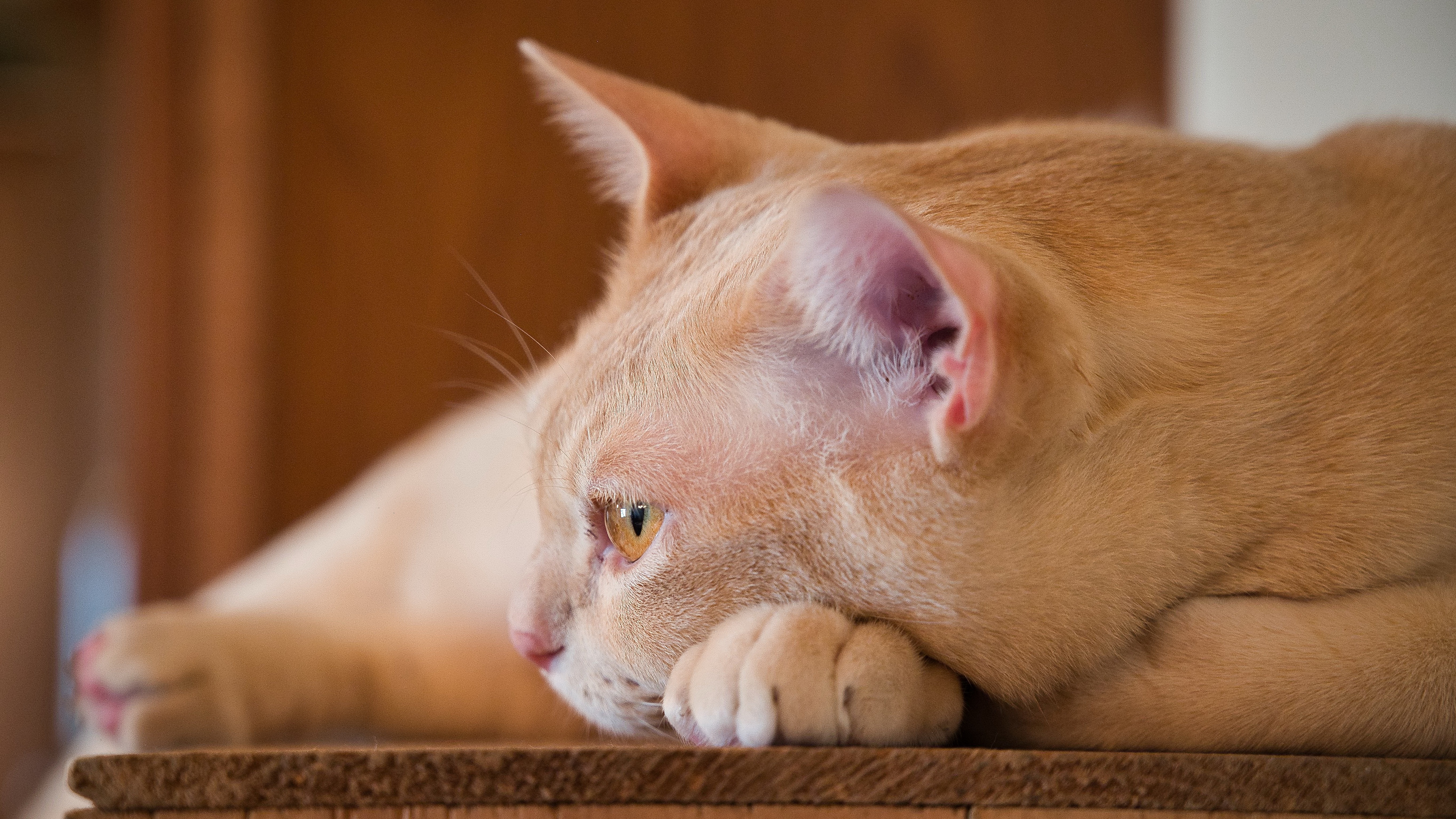 Description: A cat laying on top of a wooden table next to a wooden door and a wooden chair with a white cat.