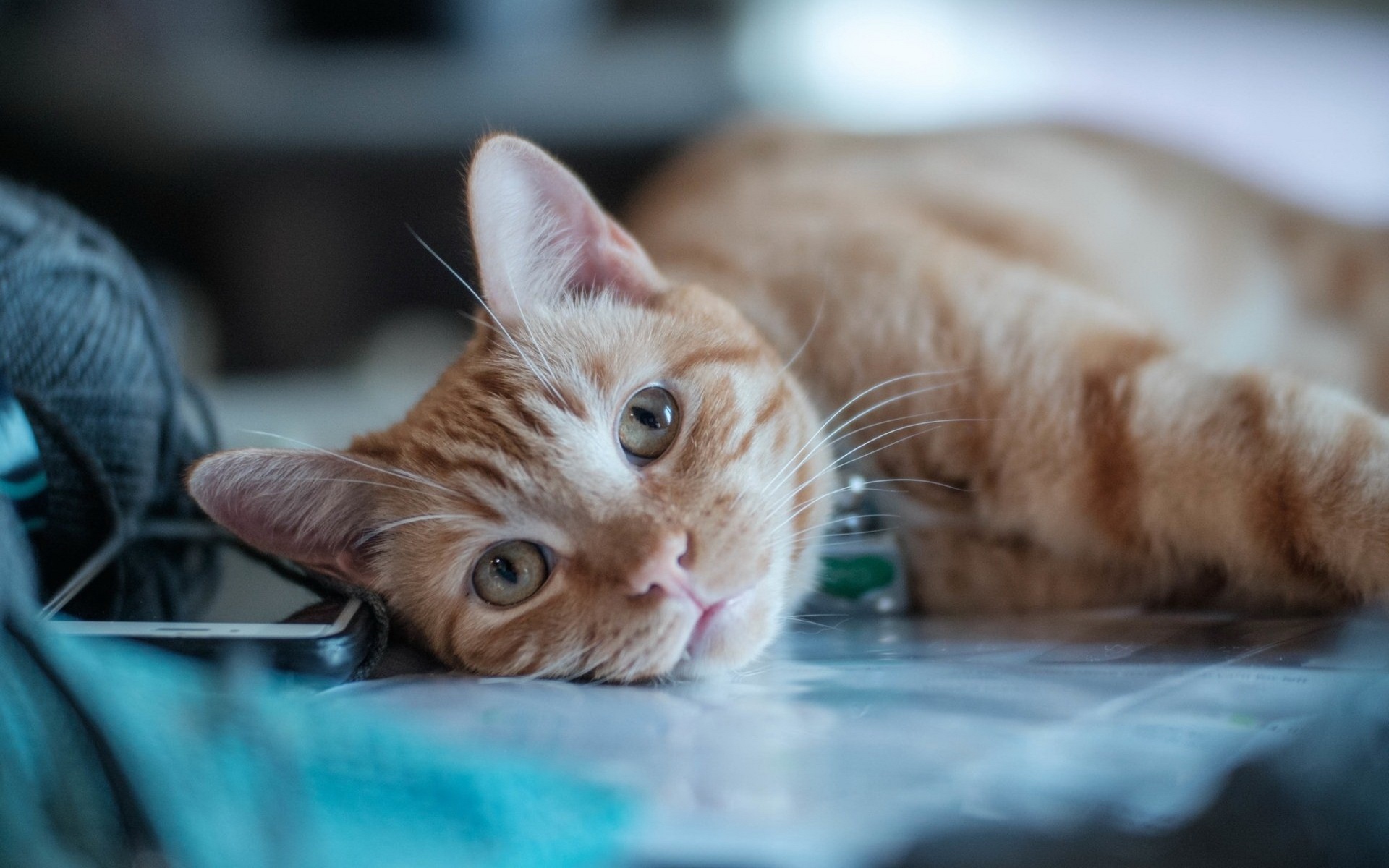 Description: A cat laying on a table with a ball of yarn in the background and a ball of yarn in the foreground.