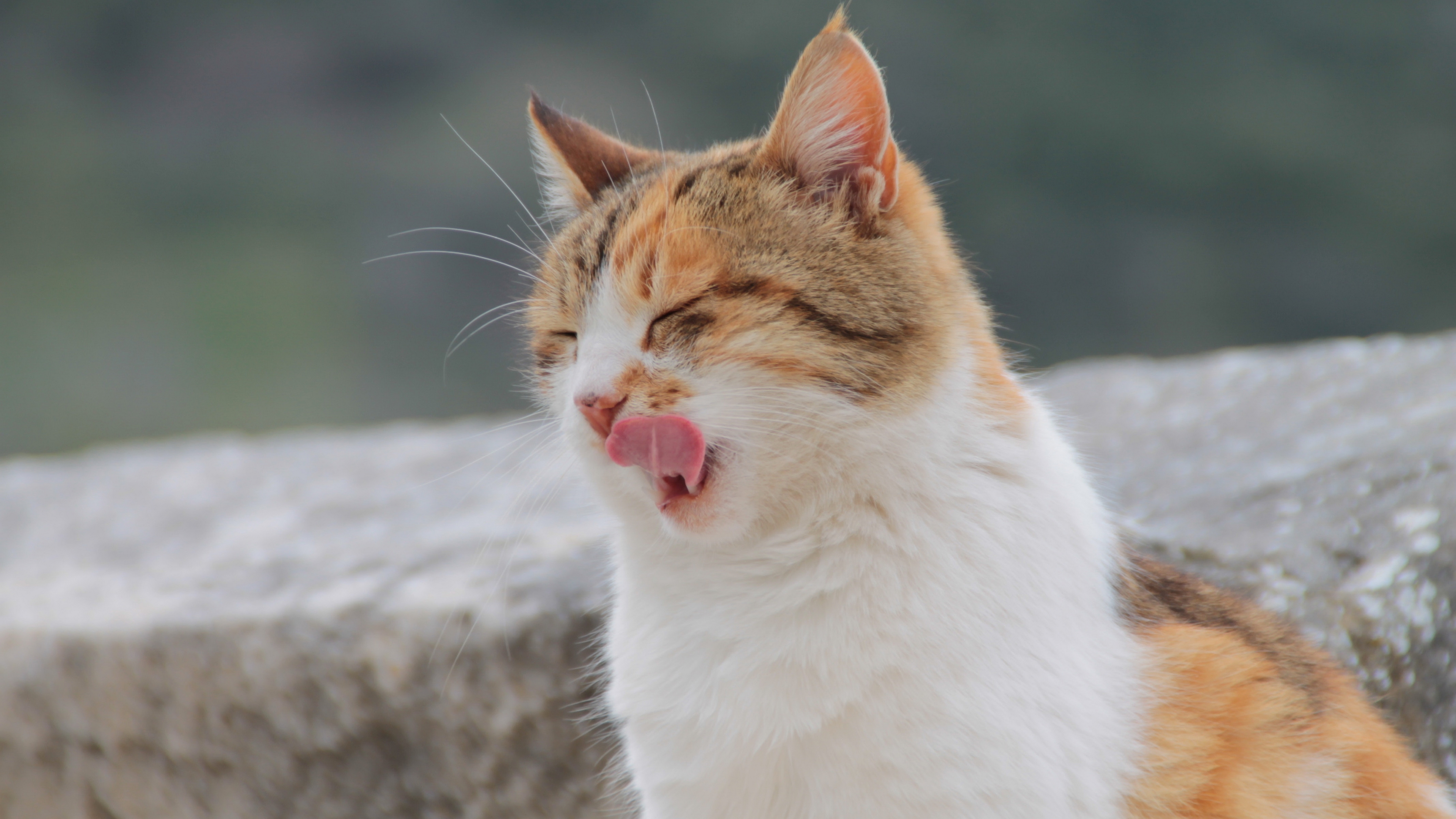 Description: A cat yawns while sitting on a ledge outside in the sun with its mouth open and tongue out.
