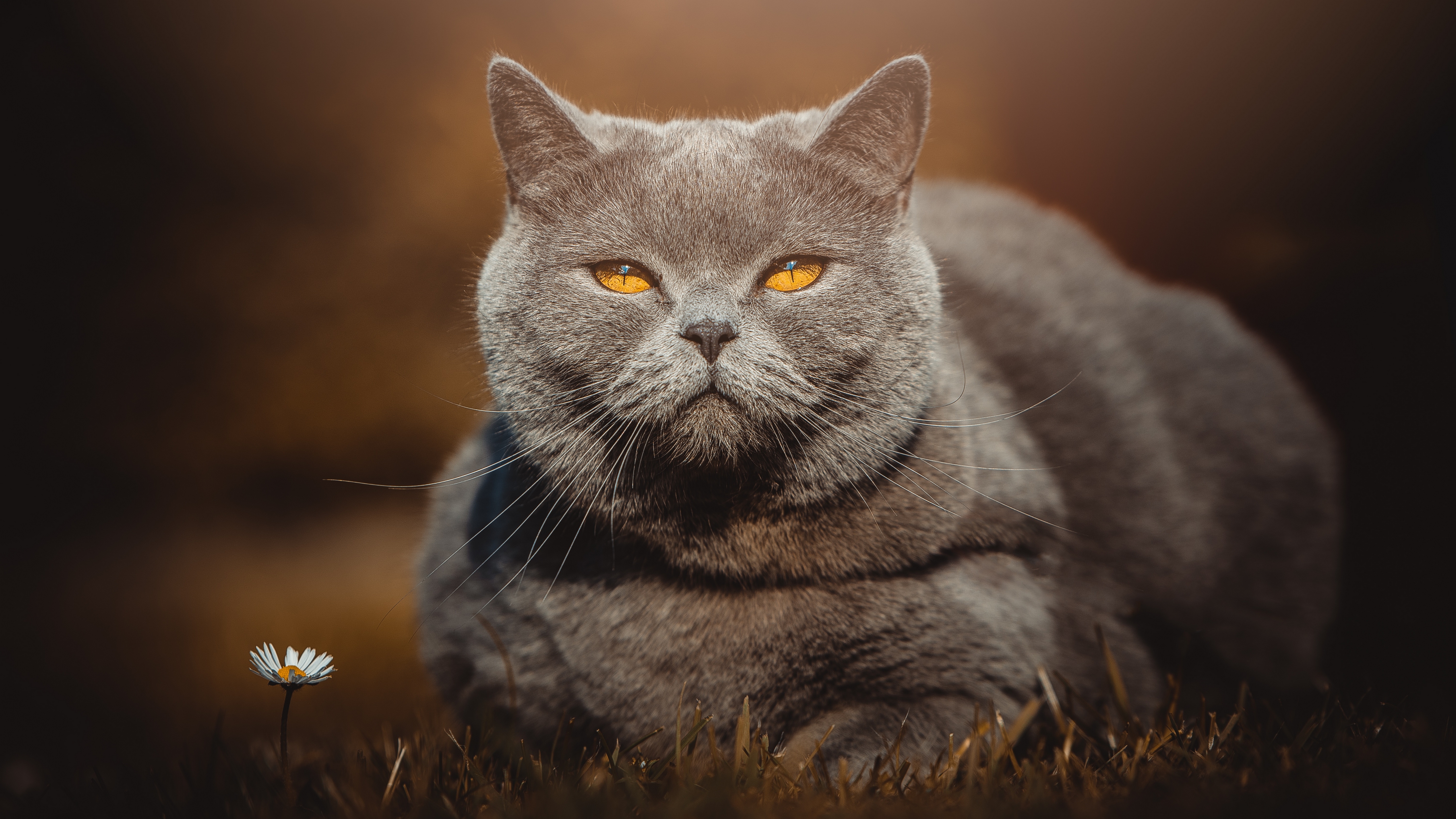 Description: A cat with yellow eyes sitting in the grass with a flower in front of it and a blurry background.