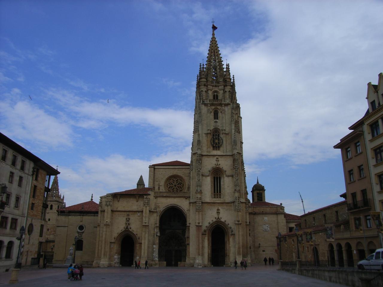 Description: A large cathedral with a clock tower in the middle of a city square with people walking around it and a few cars parked in front of it.