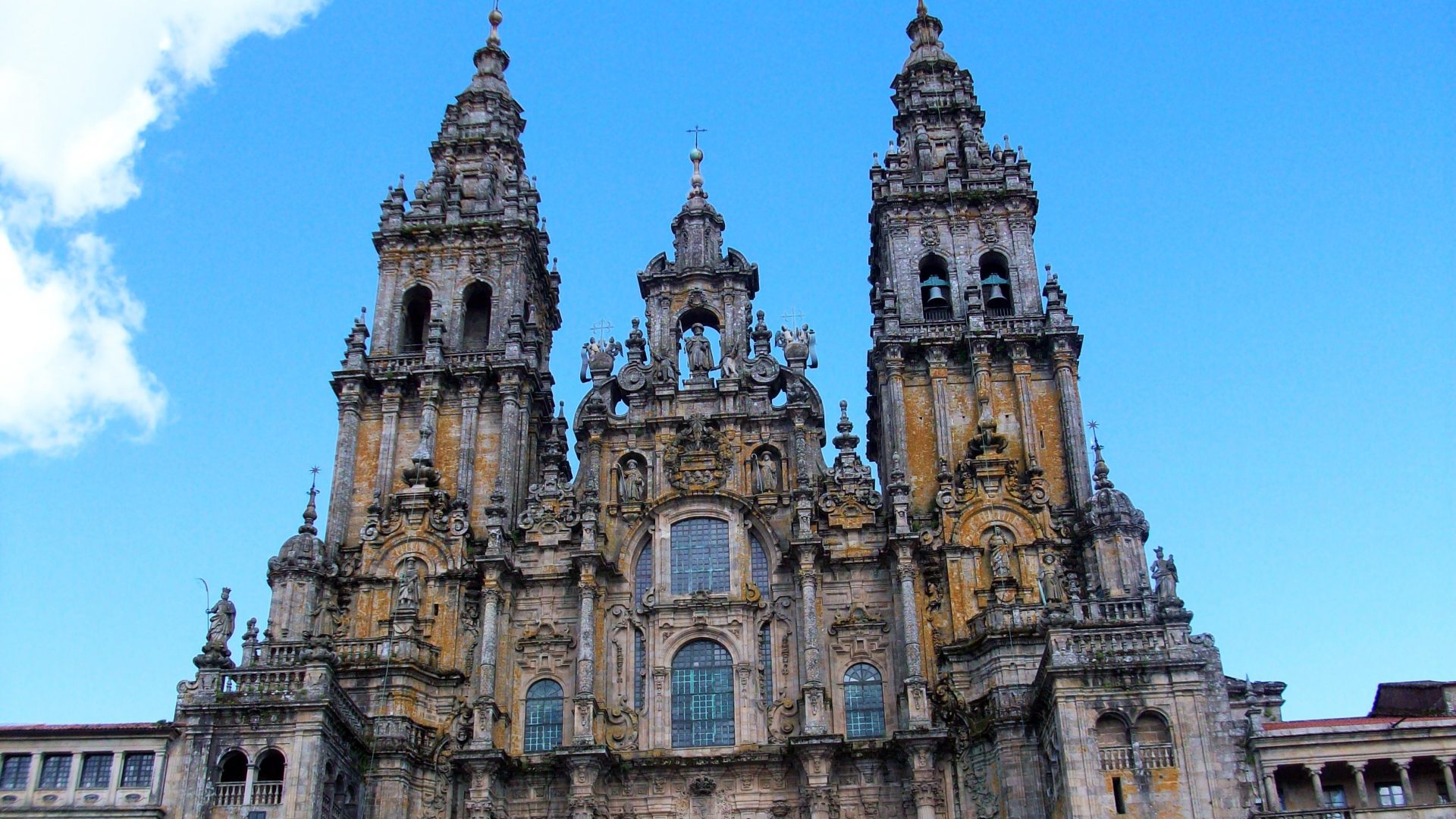 Description: A large cathedral with a clock tower on top of it's side tower and a sky background with clouds.