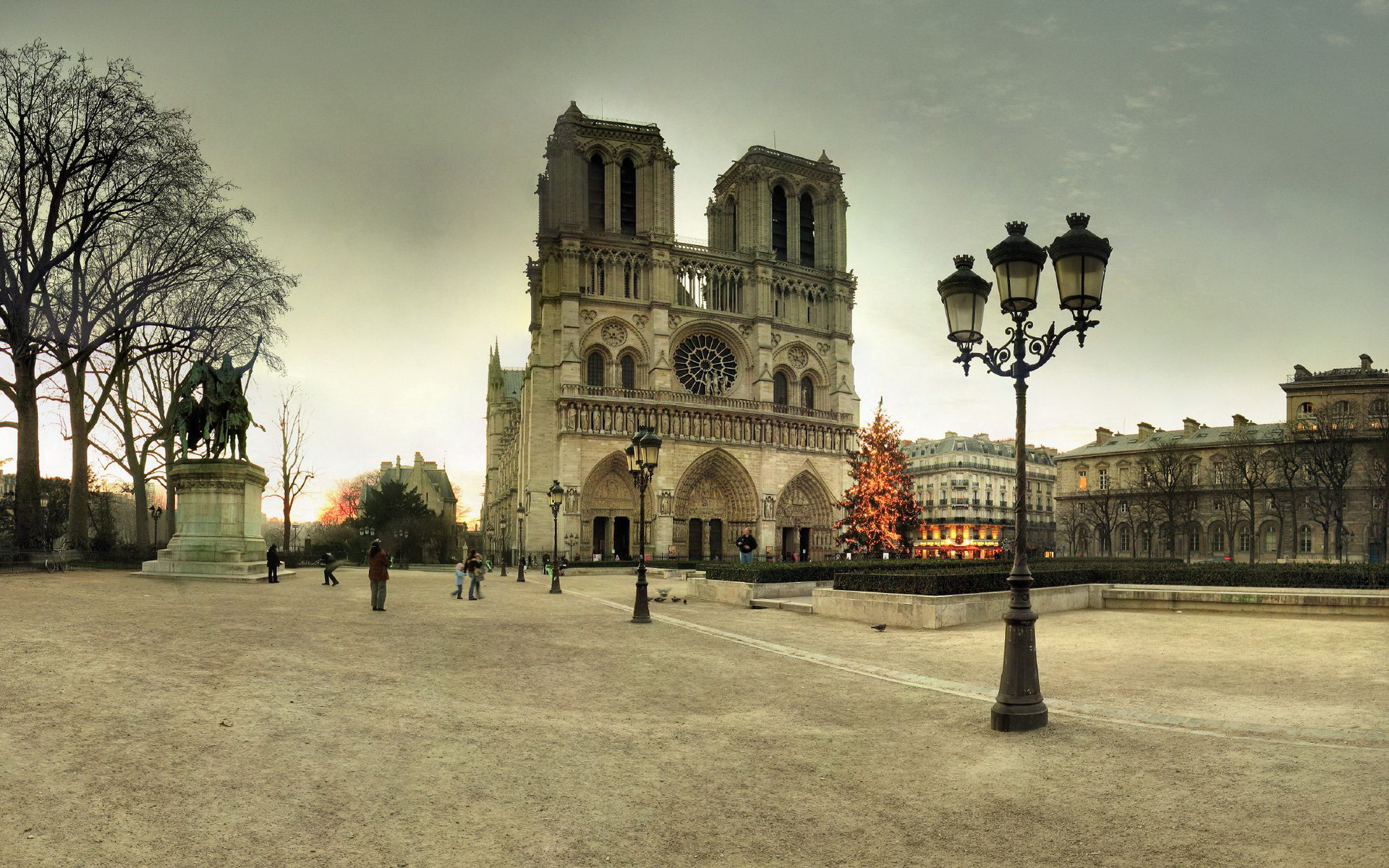 Description: A large cathedral with a clock tower in the middle of a city square with a statue of a man on a horse.