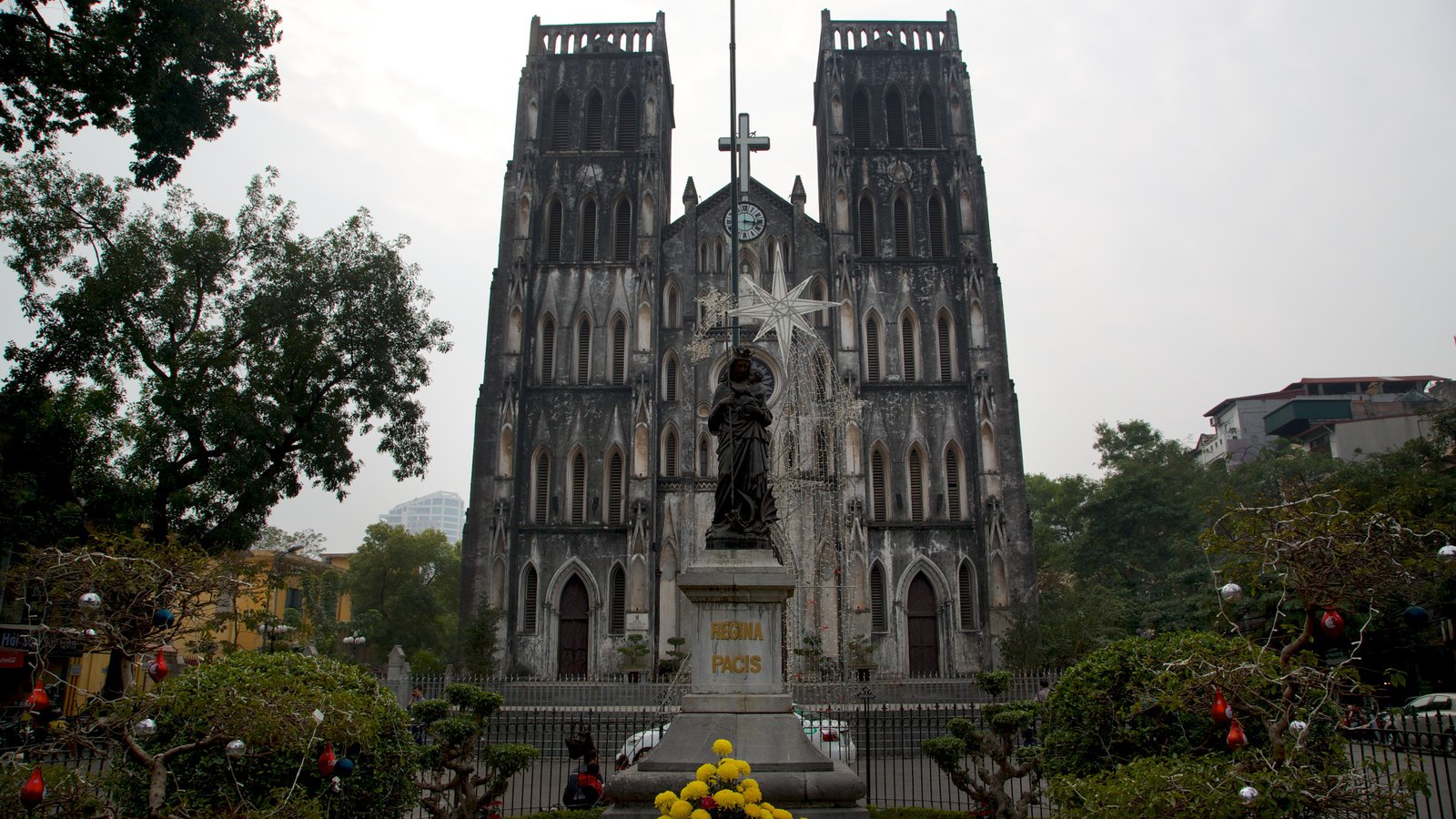 Description: A large cathedral with a statue in front of it and a yellow fire hydrant in front of it.