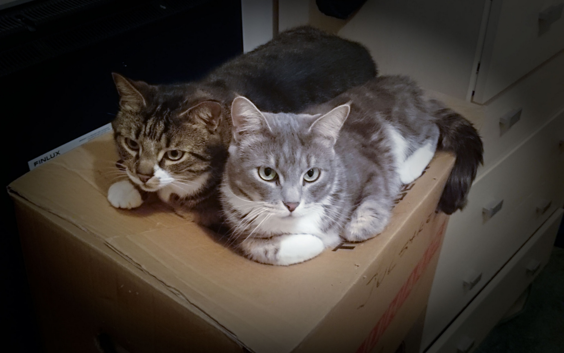 Description: Two cats laying on top of a box together on a table top with drawers in the background and a cat laying on top of a box.