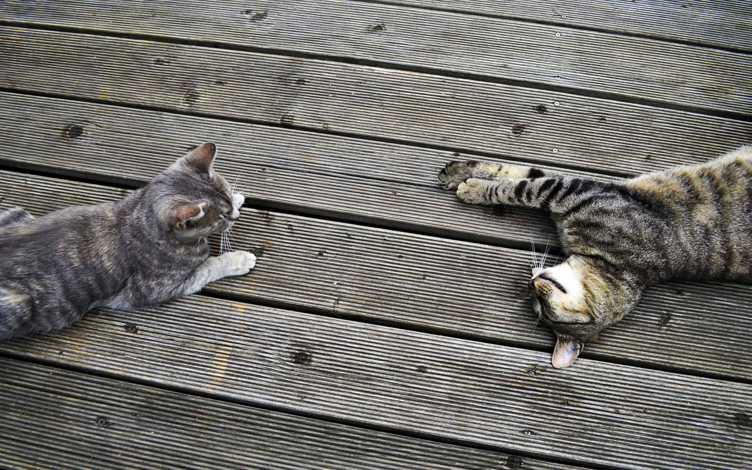 Description: Two cats laying on a wooden deck playing with each other's paws and paws.