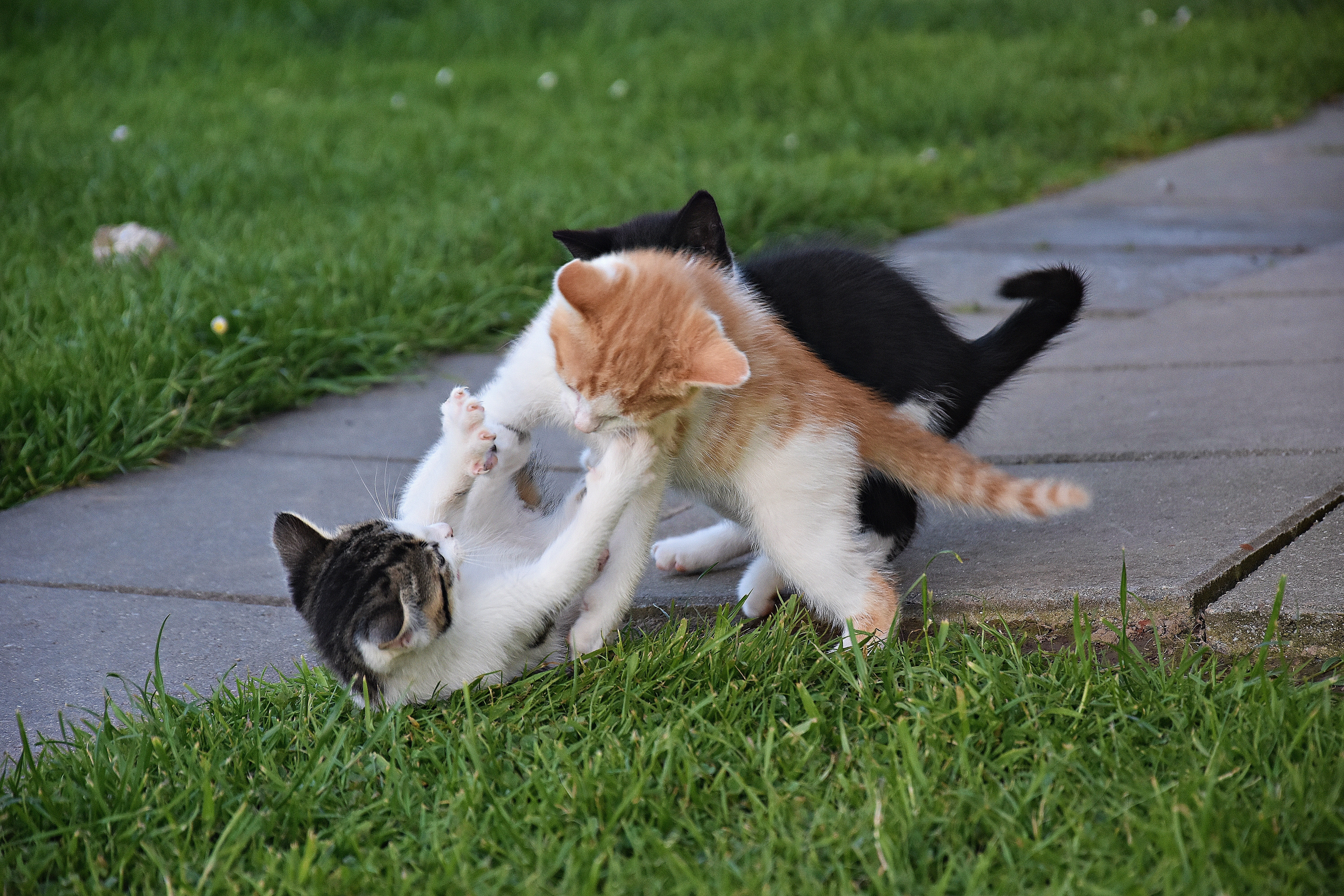 Description: Two cats playing with each other on the grass outside of a house in the daytime time.