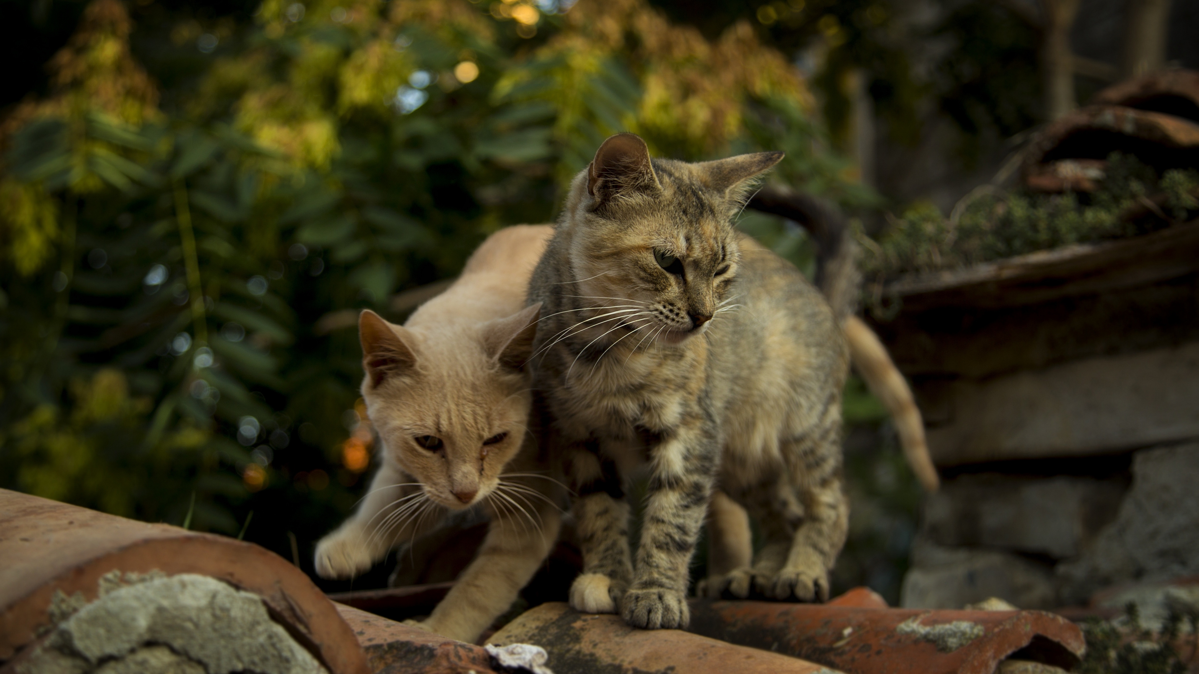 Description: Two cats standing on top of a rock wall next to each other in a garden area with trees in the background.