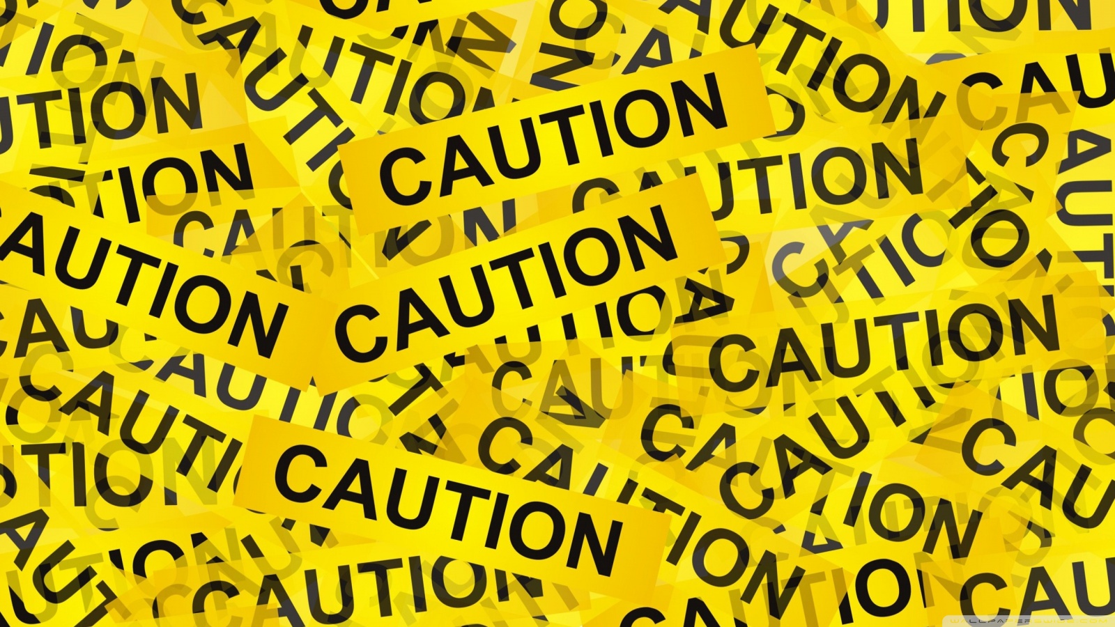 Description: A lot of caution signs are in the background of yellow tape with black letters on it and a black and white stripe.
