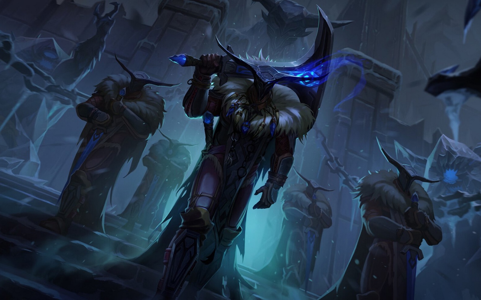 Description: A man with a sword in a dark cave with other men in the background.