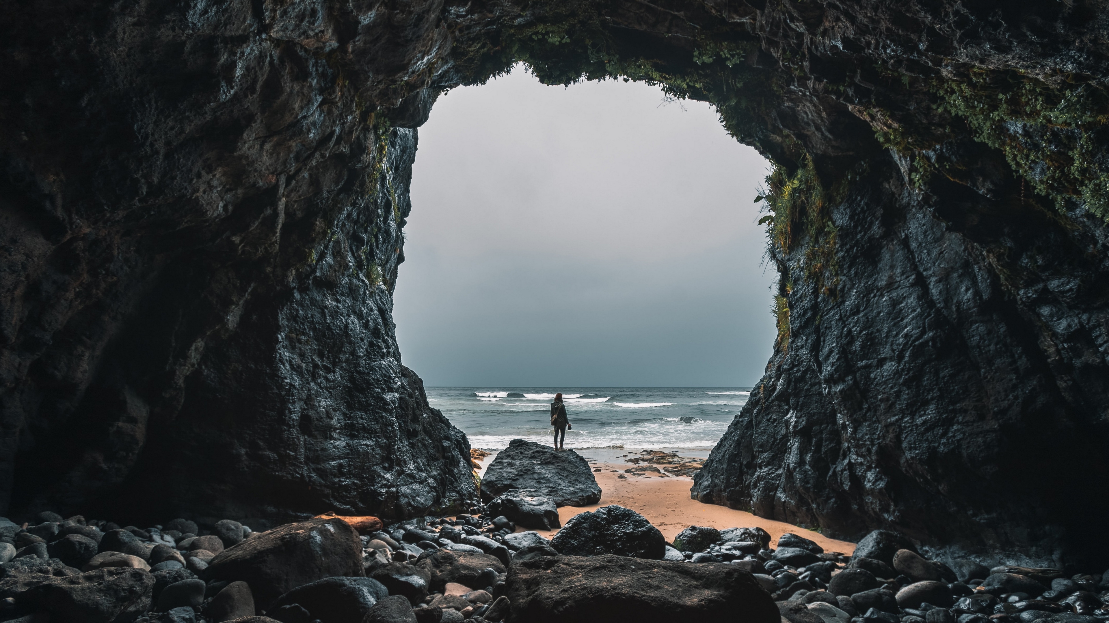Description: A person standing in a cave on a beach with rocks and water in the background and a person standing in the middle of the cave.