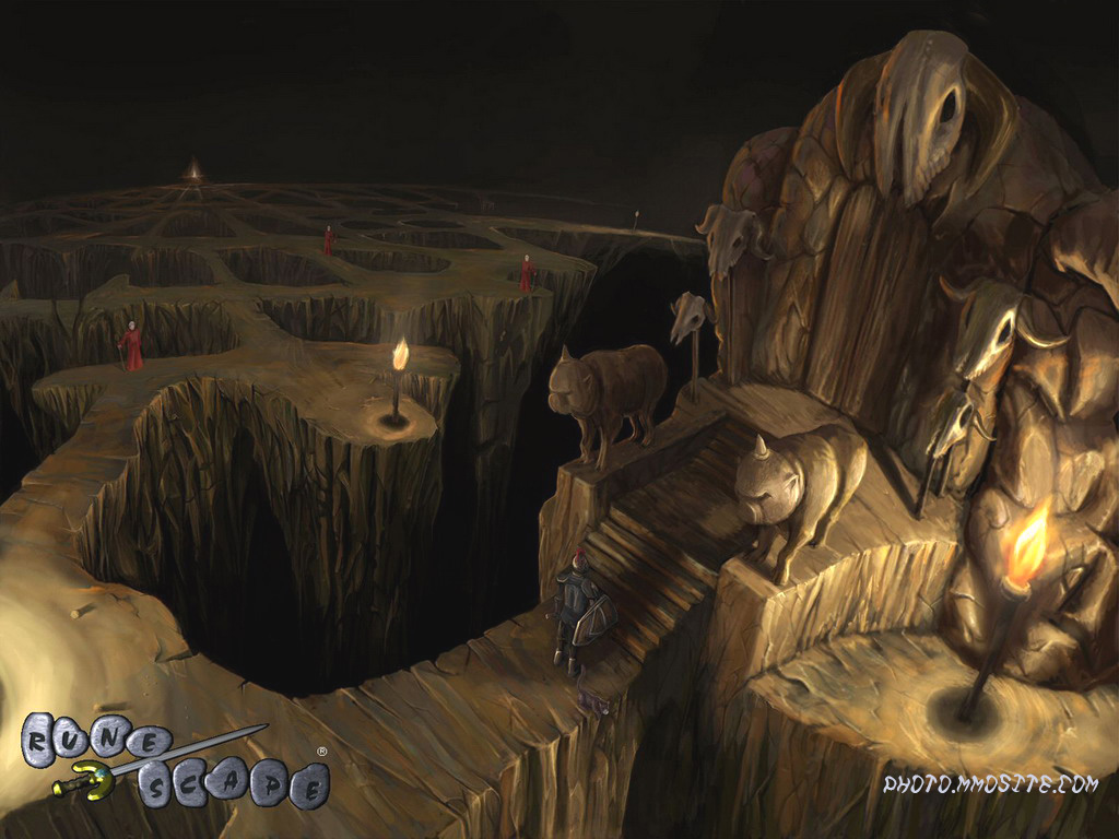 Description: A computer generated image of a cave with a bear and a man on a cliff with a candle in it.