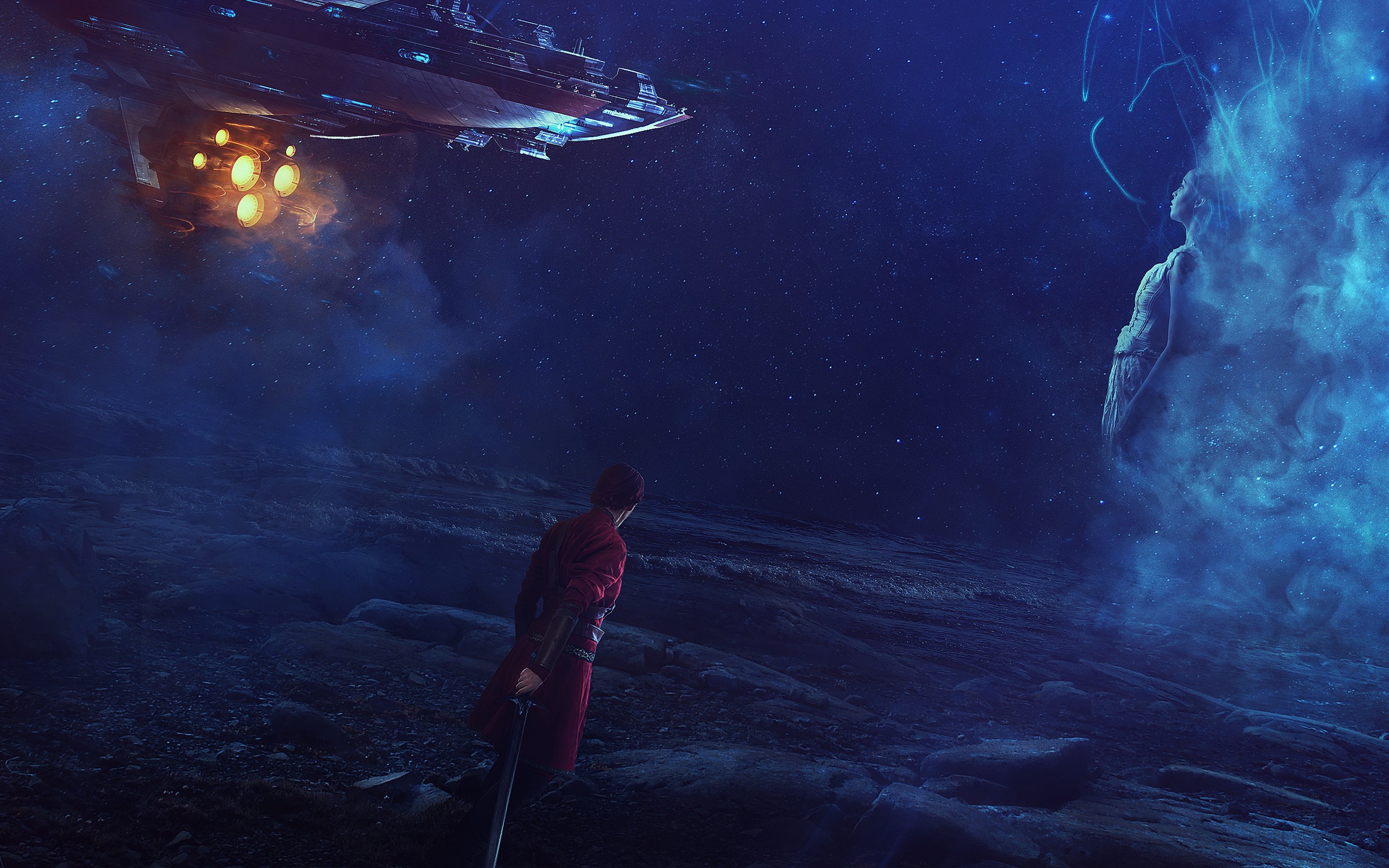 Description: A man standing in a cave looking at a spaceship in the distance with a light on it's side.