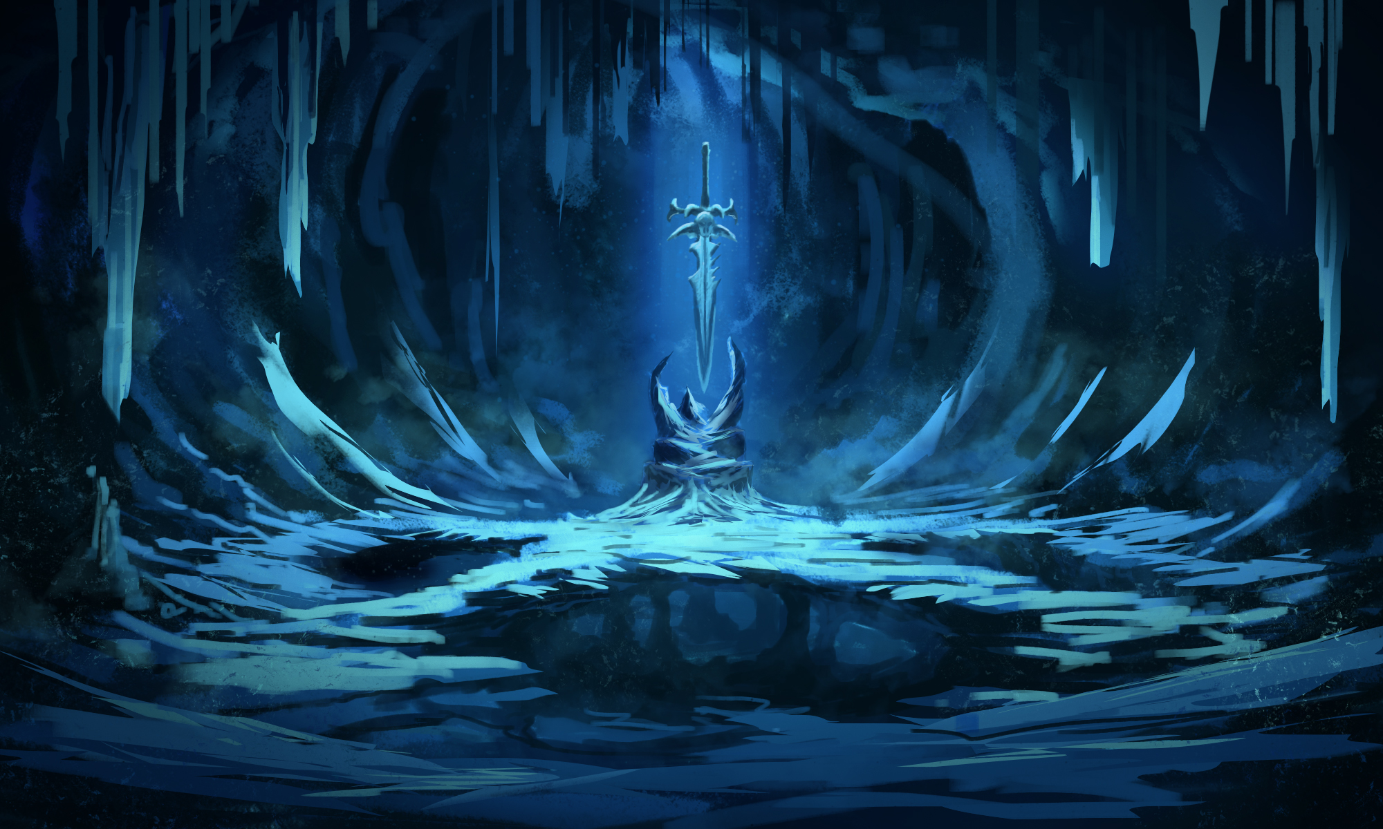 Description: A painting of a man standing in a cave with a sword in his hand and ice formations around him.