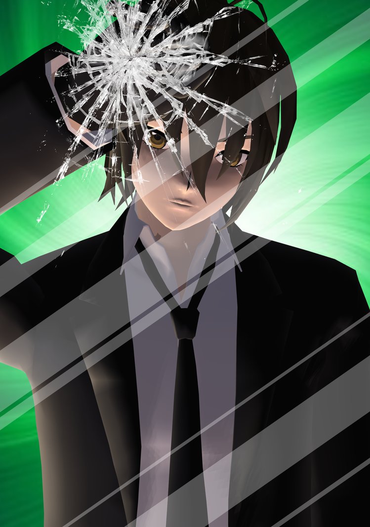 Description: A man in a suit and tie with a broken head and a green background with a green light behind him.
