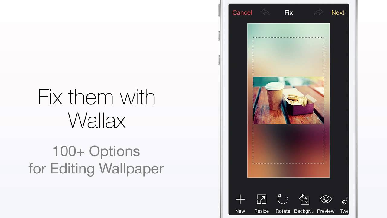 Description: A cell phone with a picture of a table and a cup of coffee on it and the text fix them with wallax.