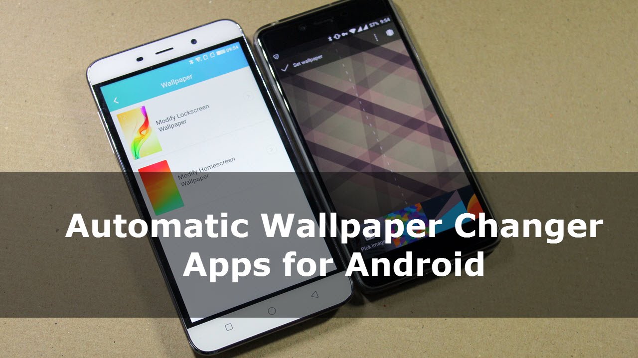 Description: Two cell phones sitting next to each other on a table with the text automatic wallpaper changer apps for android.