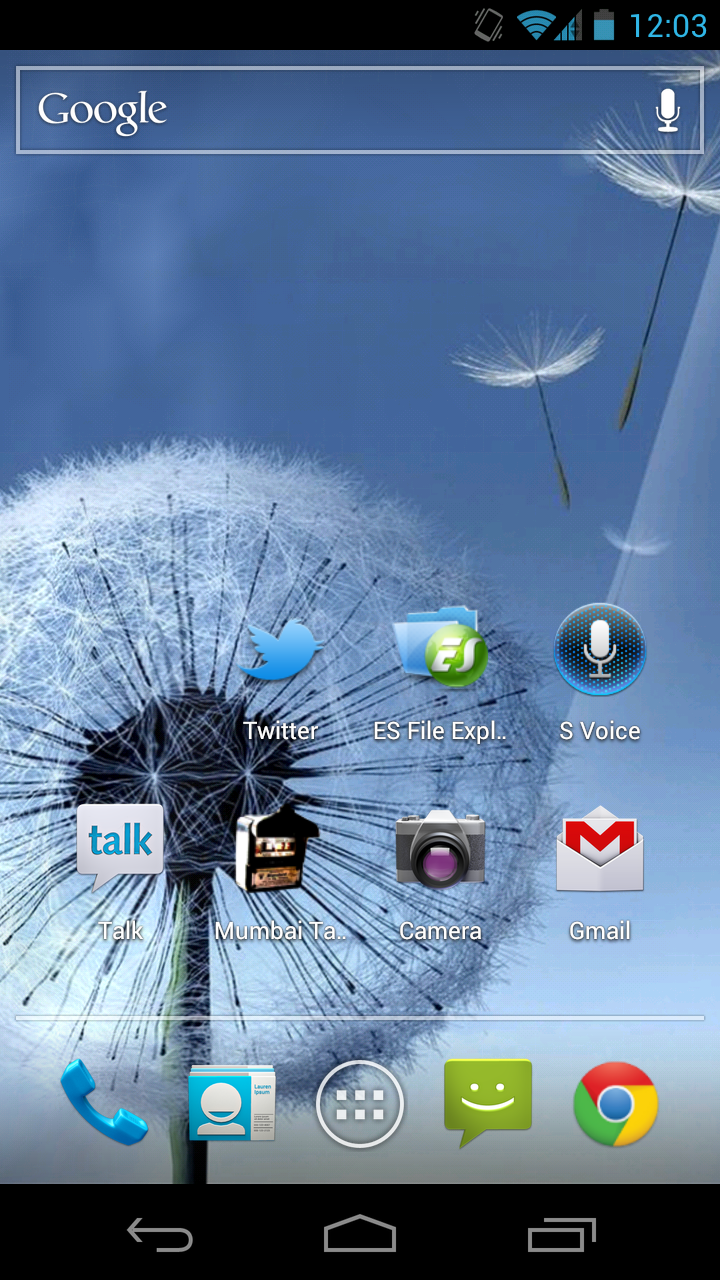 Description: A close up of a cell phone with a dandelion on it's screen and a sky background.