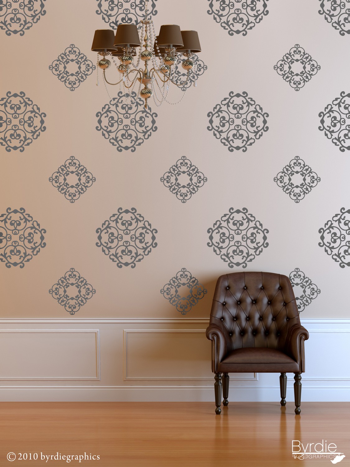 Description: A chair and a chandelier in a room with a wallpapered wall and a chandelier.