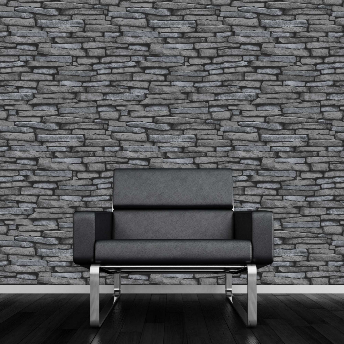 Description: A chair sitting in front of a stone wall with a black leather seat on it's side.