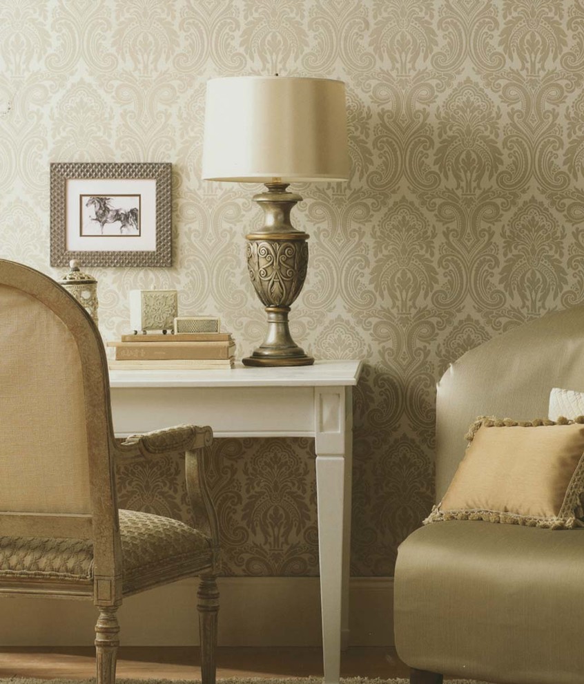 Description: A chair and a table with a lamp on it in a room with a wallpapered wall and a chair.