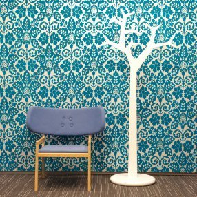 Description: A chair and a tree in a room with a wallpapered wall and flooring with a blue chair.