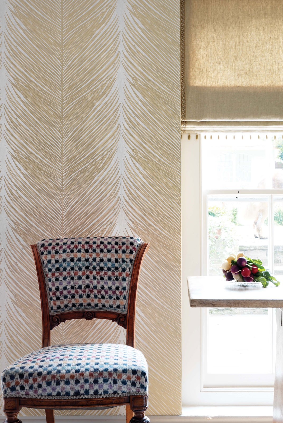 Description: A chair sitting in front of a window next to a table with a vase of flowers on it and a vase of flowers on the table.