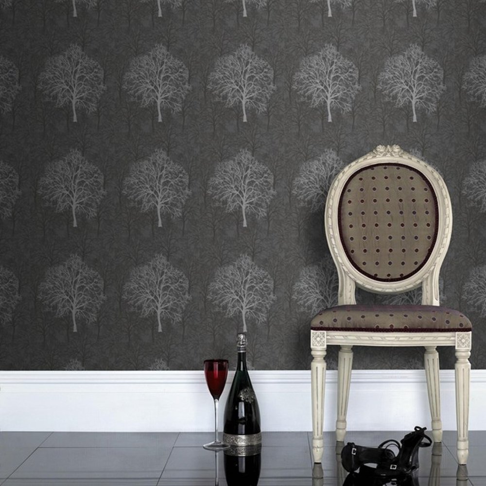 Description: A chair and a bottle of wine in a room with a wallpapered wall and flooring with a tree pattern.