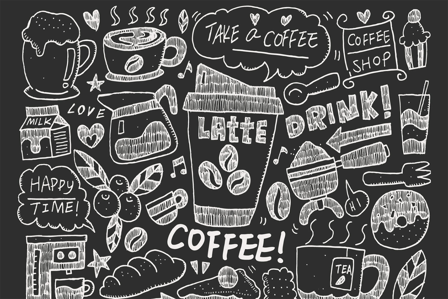 Description: A chalkboard drawing of coffee related items and words on a blackboard background with a chalk effect in the middle.