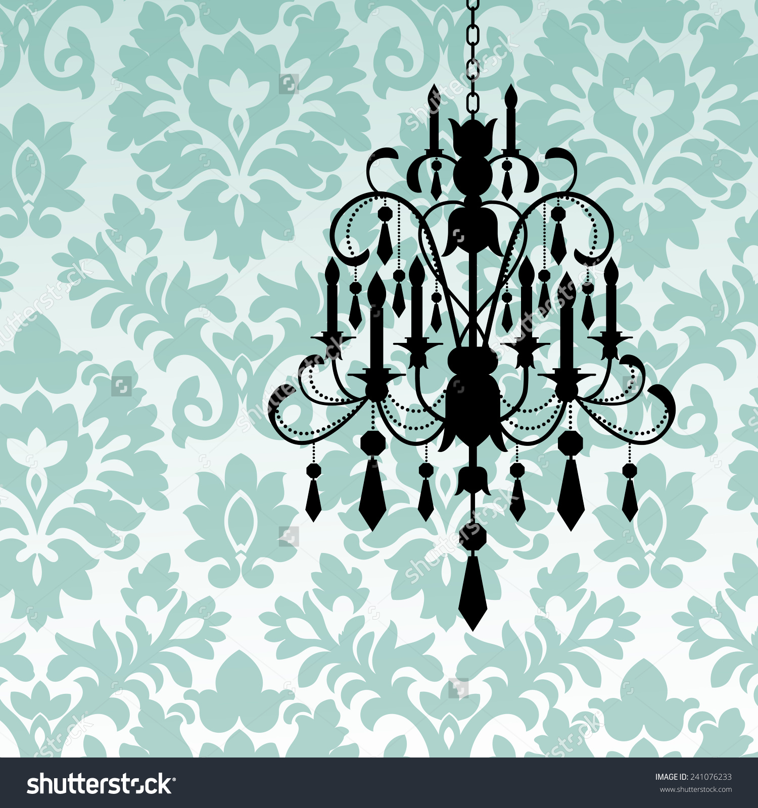 Description: A chandelier hanging from a ceiling in a room with a wallpaper pattern and a blue wall.