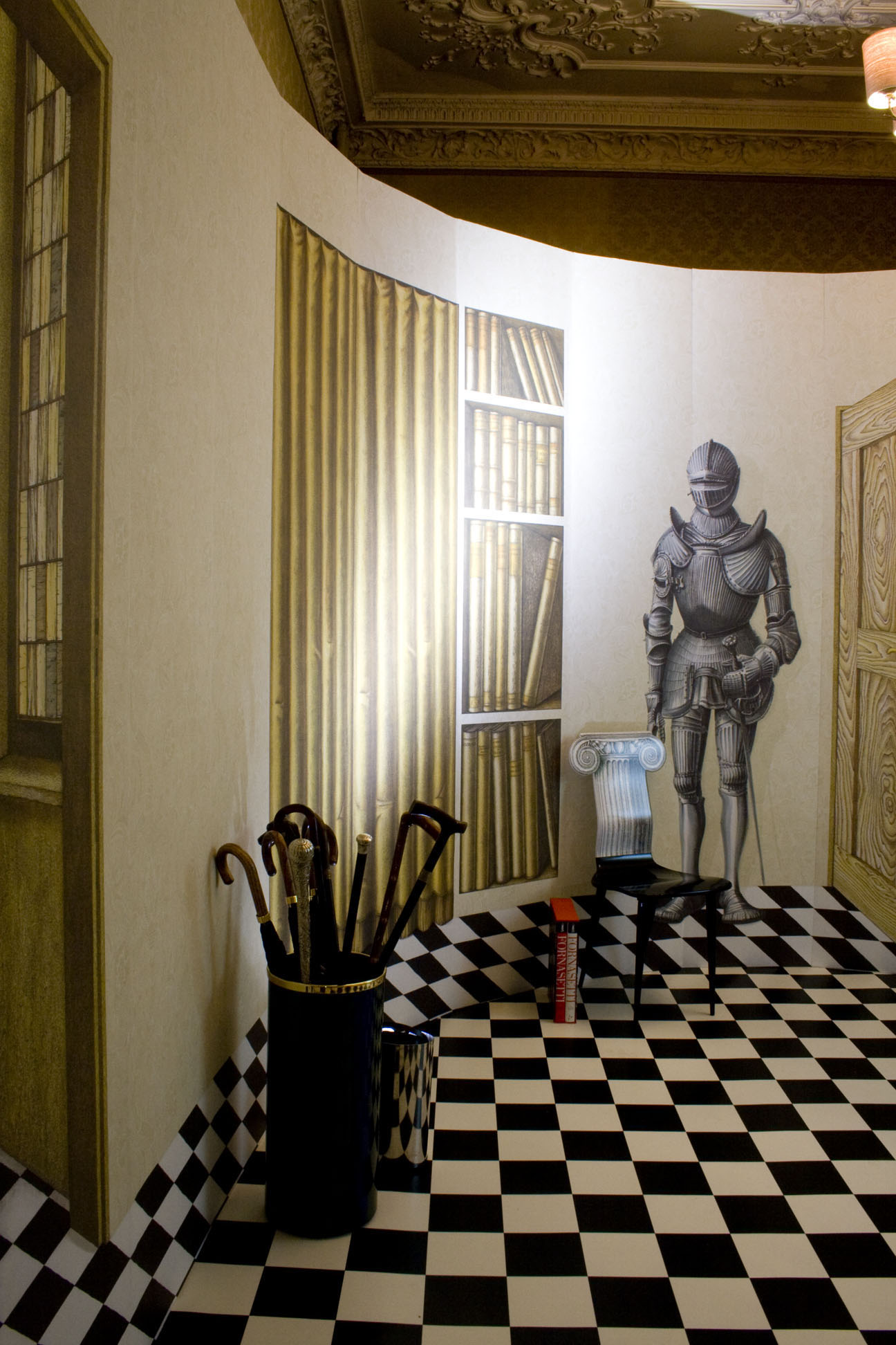 Description: A room with a checkered floor and a painting of a knight on the wall and a vase with umbrellas.
