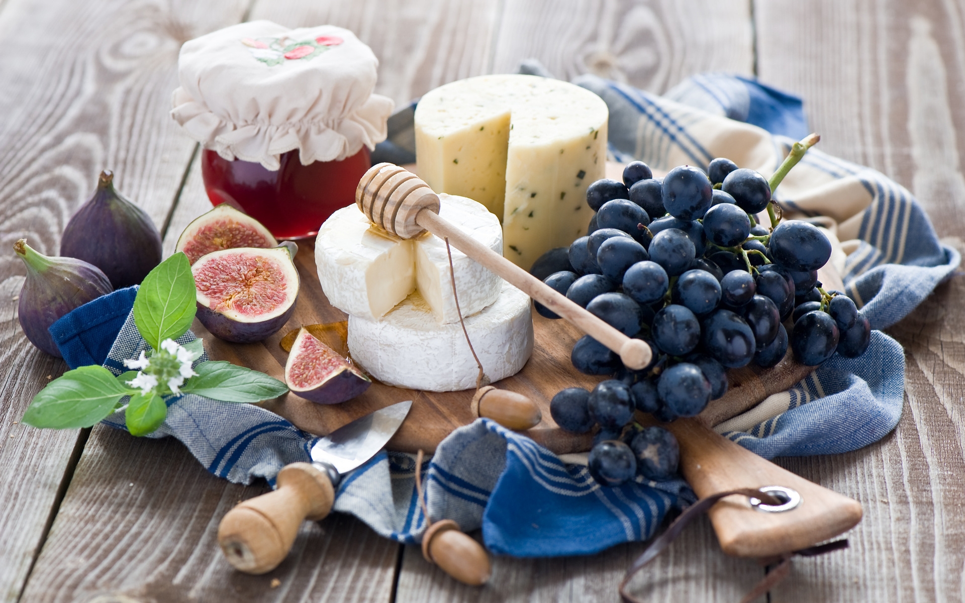 Description: A plate of cheese and fruit on a wooden table with a knife and fork and a honey comb and a honey jar.