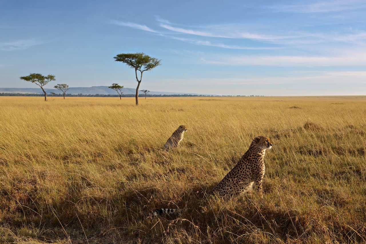 Description: Two cheetah in a field of tall grass with trees in the background and a blue sky with clouds.