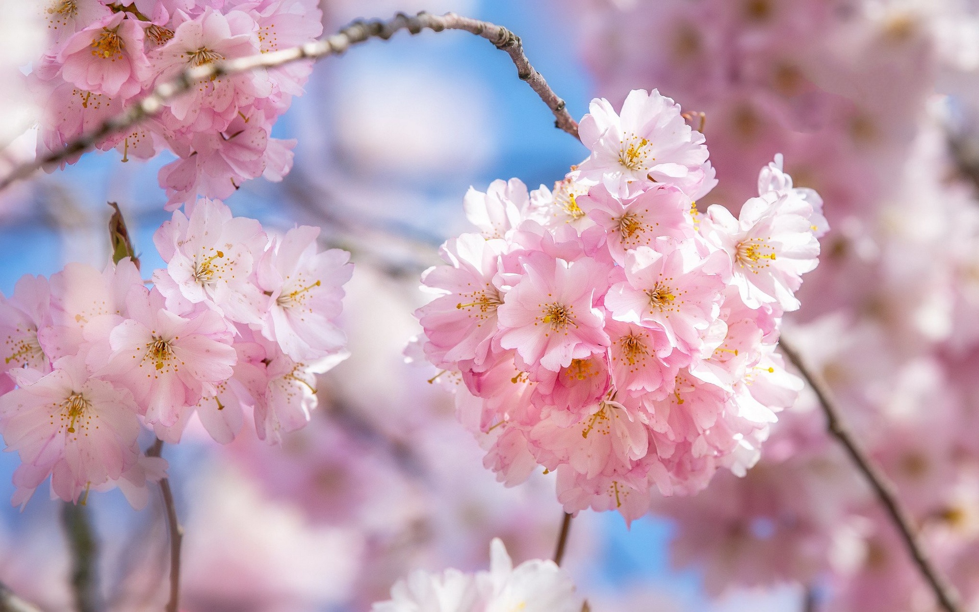 Description: A close up of a tree with pink flowers on it's branches and a blue sky in the background.
