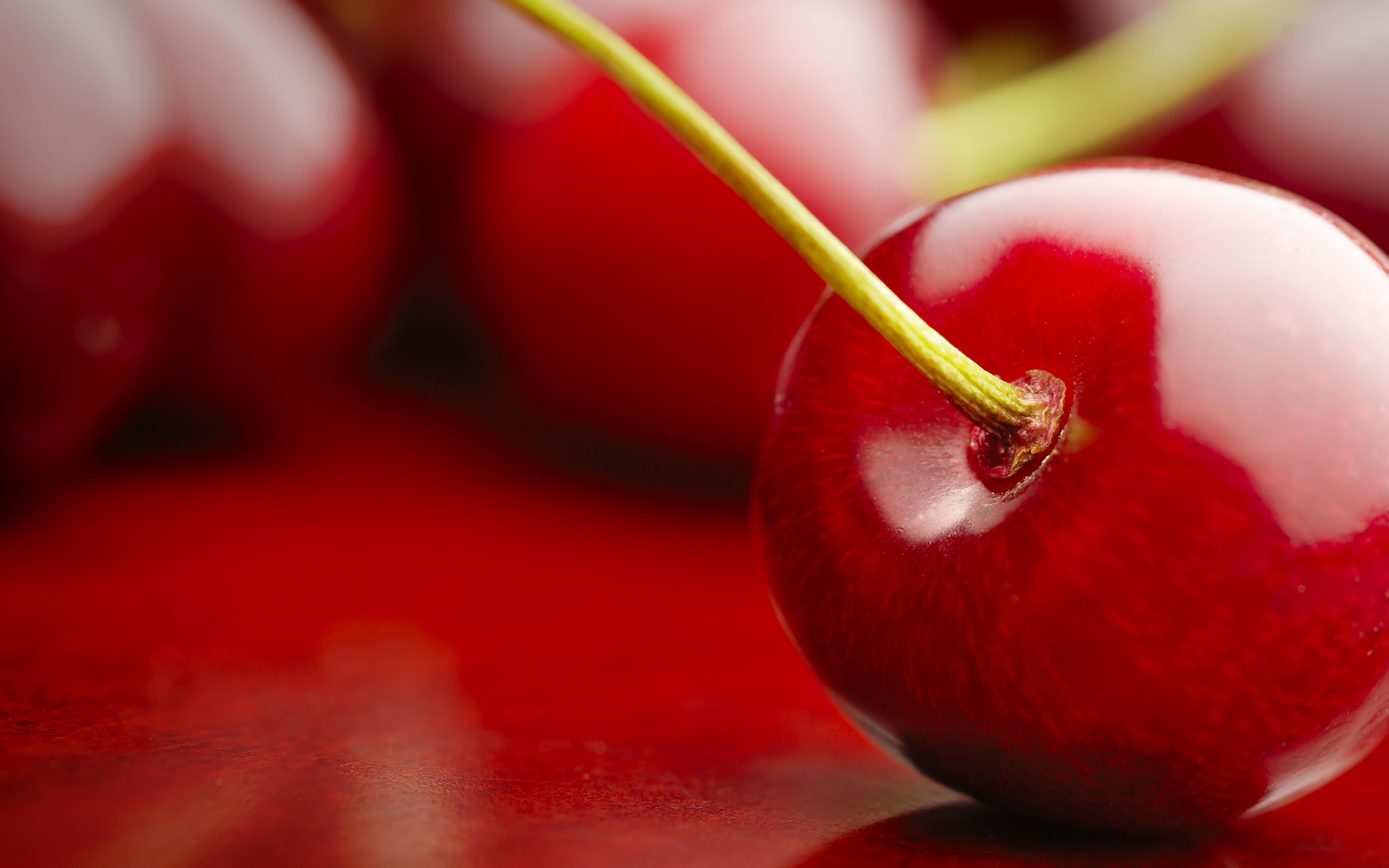 Description: A close up of a cherry on a table with other cherries in the background and a green stem.