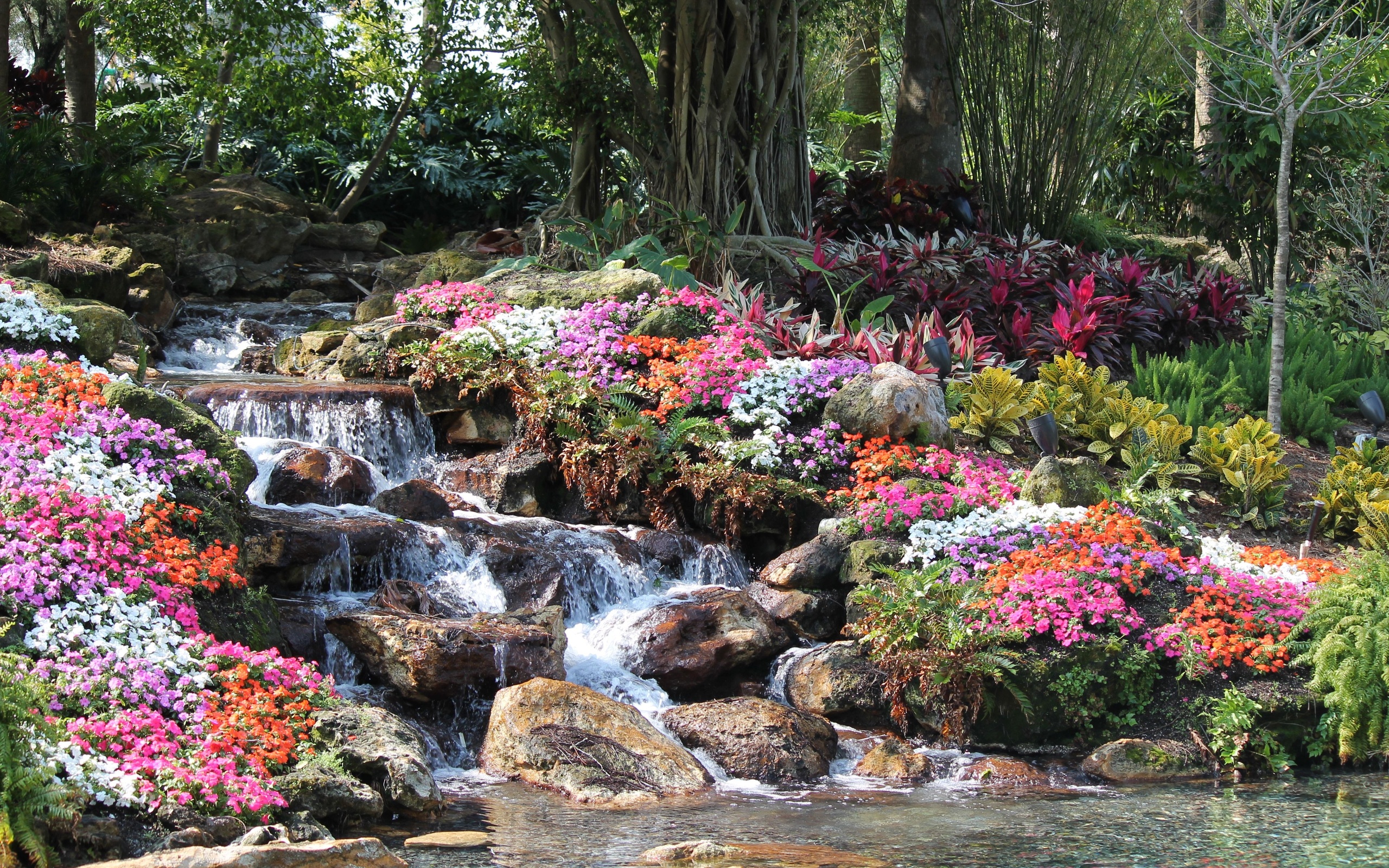 Description: A waterfall surrounded by flowers and trees in a garden area with a pond and waterfall in the middle of the picture.
