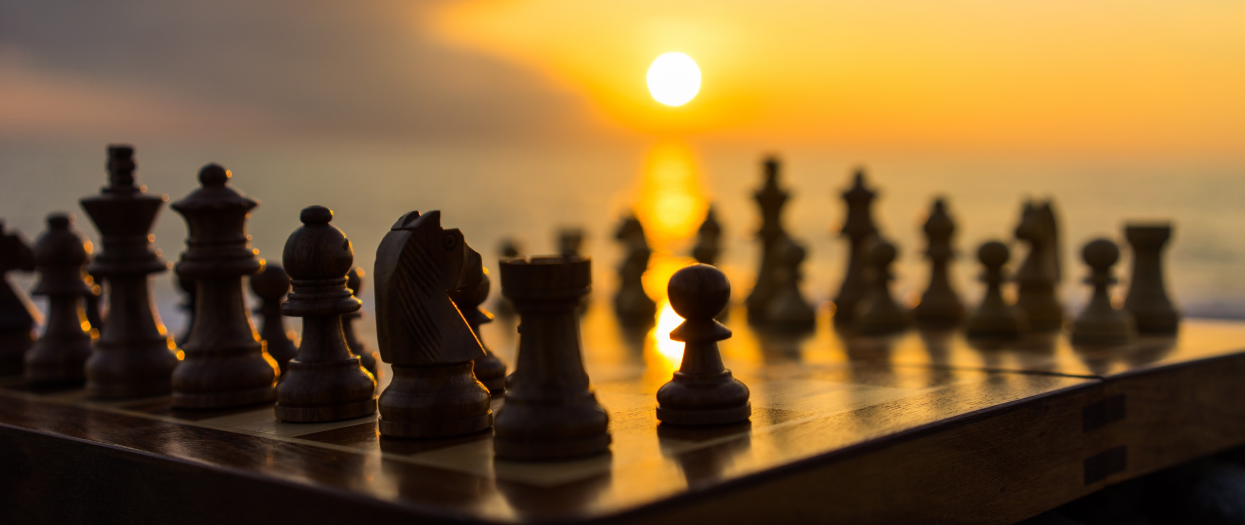 Description: A chess board with a sunset in the background and a chess set on the table with the sun setting.