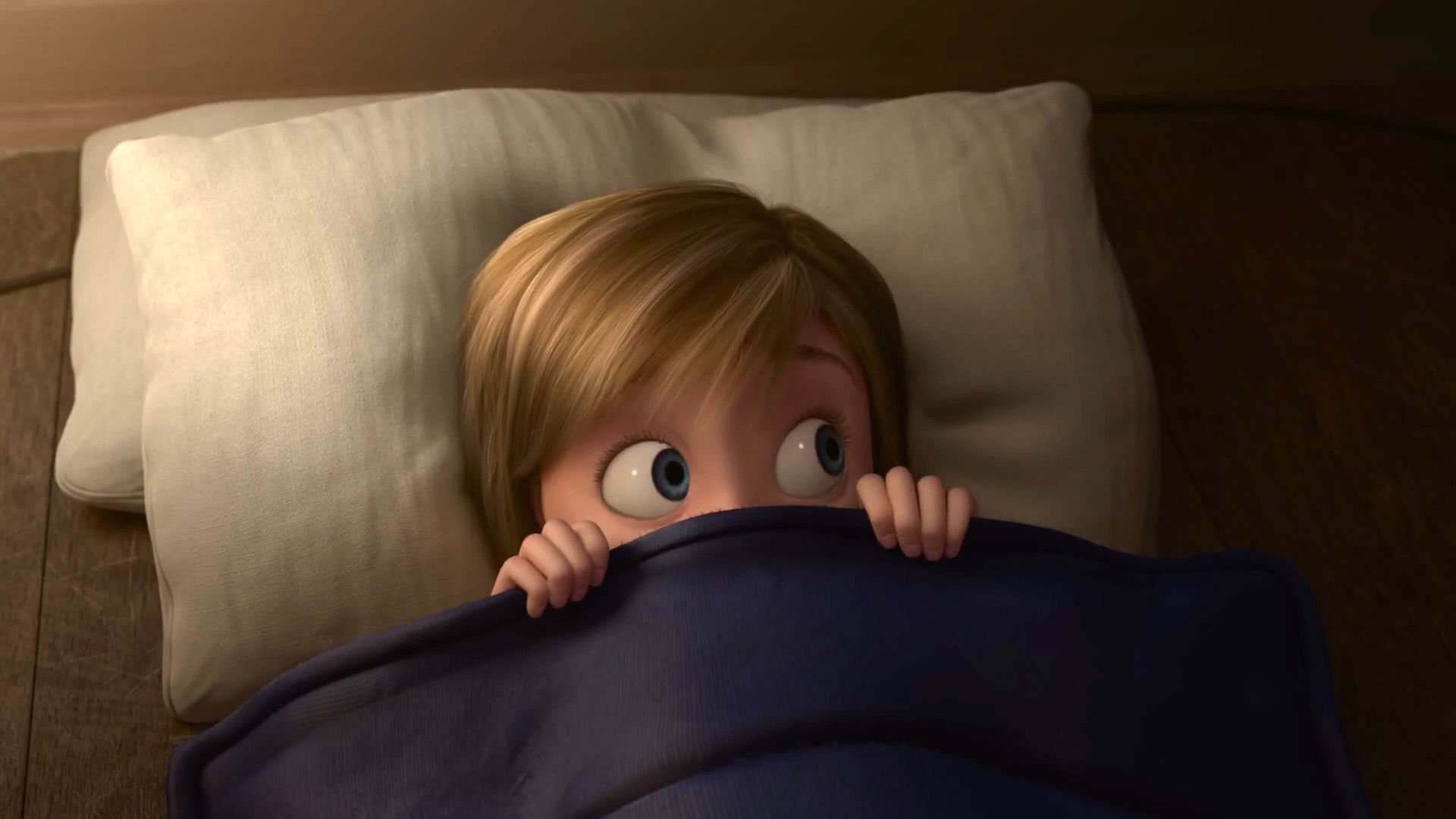 Description: A child is hiding under a blanket with eyes wide open and a pillow behind him is a pillow with a pillow on it.