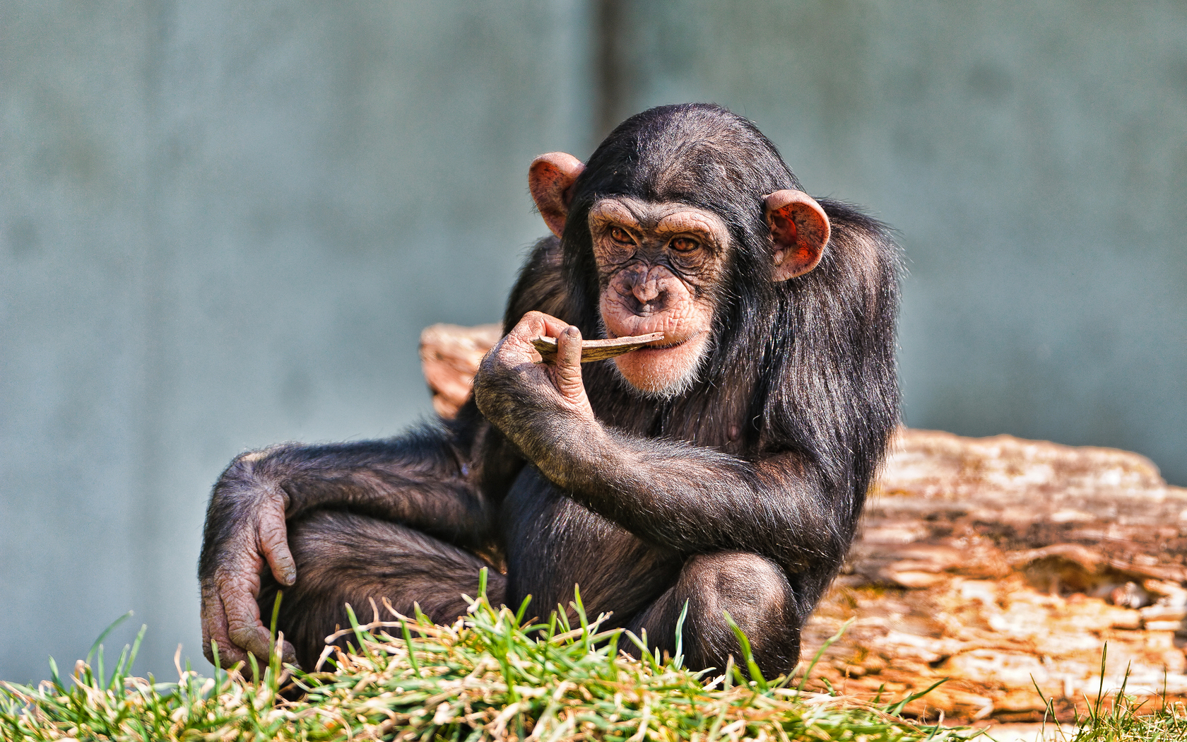 Description: A chimpan sitting on a log eating a piece of food with his hands and face to the side.