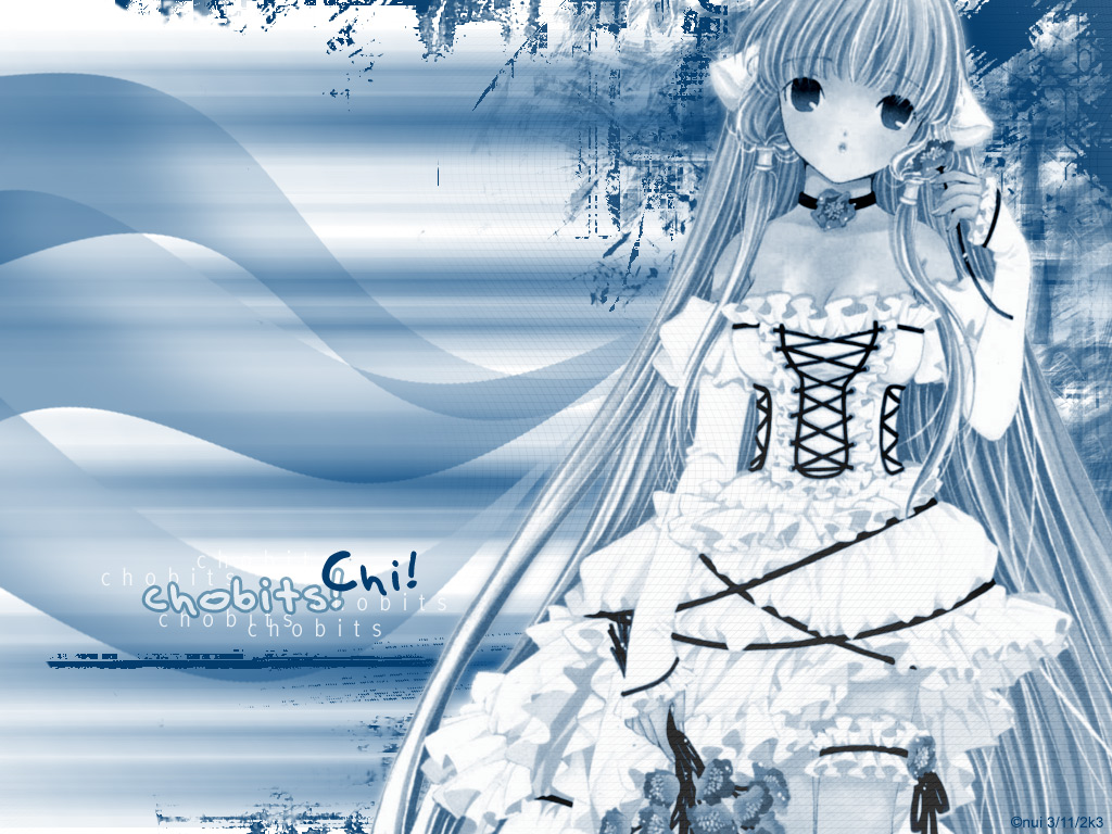 Description: A anime girl with long hair and a dress on a blue background with a wave of water behind her.