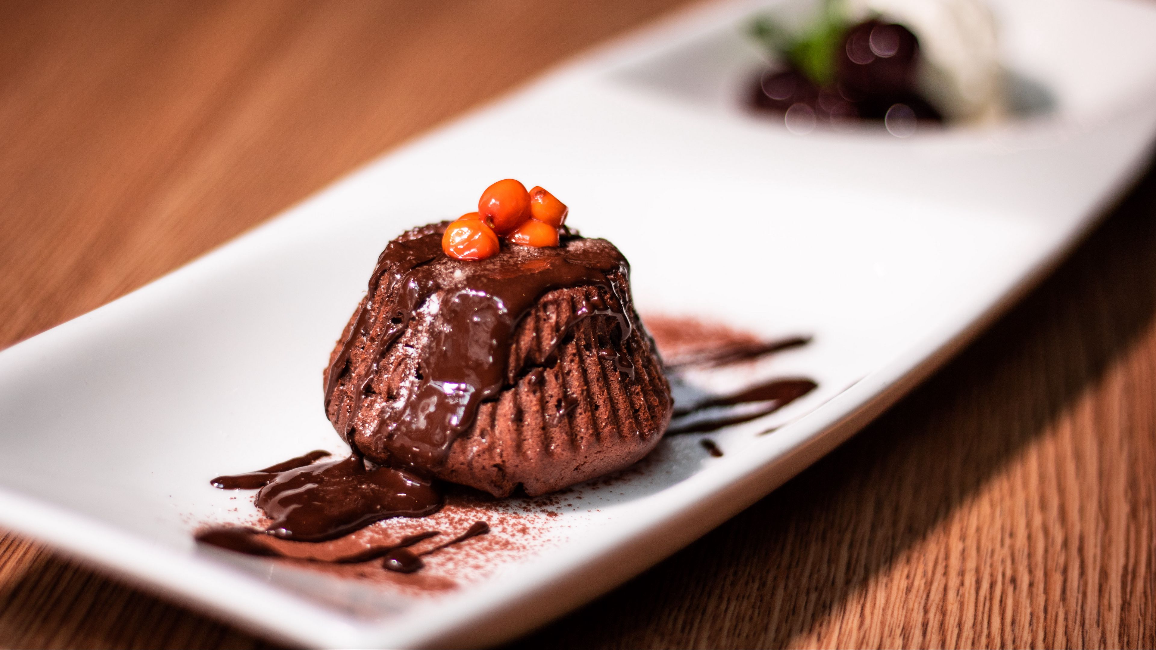 Description: A small dessert on a white plate on a wooden table with a spoon and a fork in it and a small chocolate dessert on the plate.